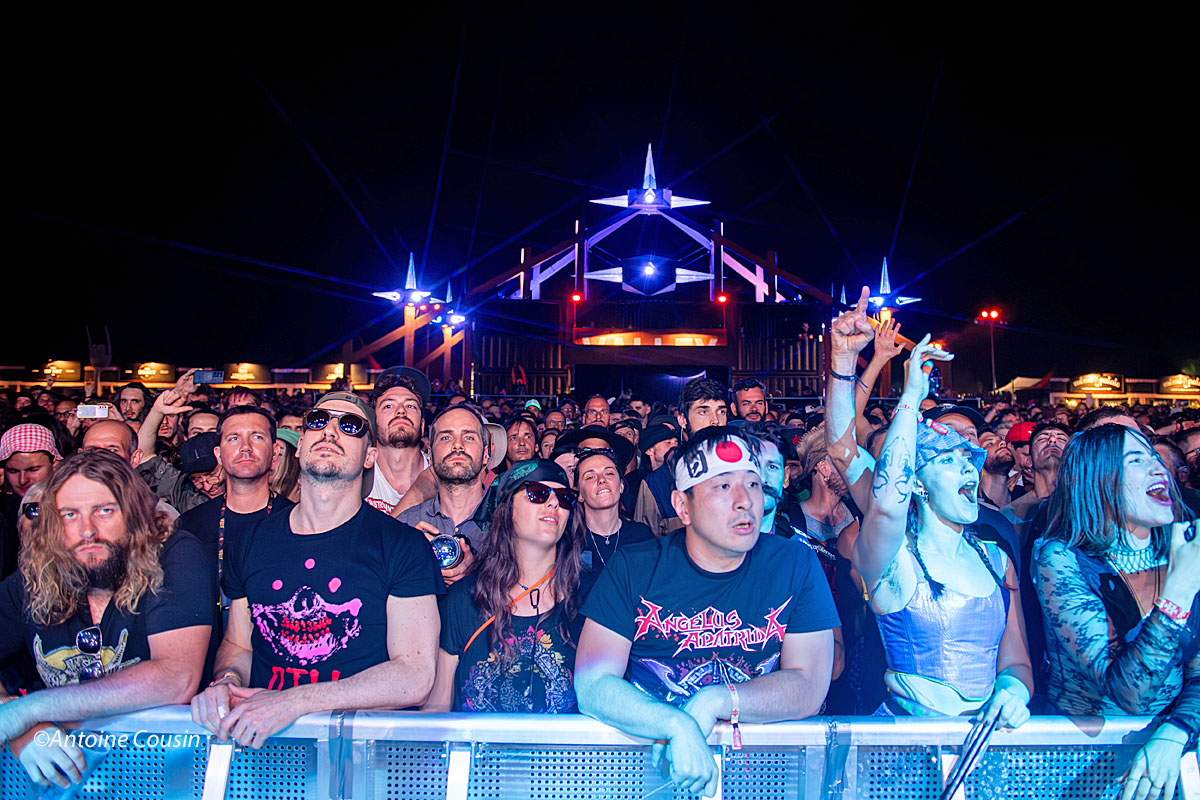 Deuxième nouveauté, et pas des moindres, l’arrivée tant attendu de la gardienne des ténèbres. Cette méga structure de 10 mètres de haut et 38 tonnes (mais chut ne parlons pas du poids des dames) est donc la partie supérieure d’une femme sur un corps d’araignée et avec une queue de scorpion et des cornes de bélier. Celle-ci peut éjecter de l’eau, de la fumée et du feu par sa bouche ou son appendice, n’étant pas encore complètement terminée, elle ne peut pas encore transporter de festivaliers sur son dos (à la façon de l’éléphant de Nantes) mais elle fût quand même mise en mouvement. Sa présence aura attiré tous les regards et il y a fort à parier que chacun y est allé de sa petite photo. Enfin, sur la programmation, mentionnons le fait que 55% des groupes n’ont jamais joué au HELLFEST (n’en déplaise à ceux qui disent : « C’est toujours les mêmes groupes qui viennent et une augmentation des groupes avec au moins une femme dans ses rangs » .