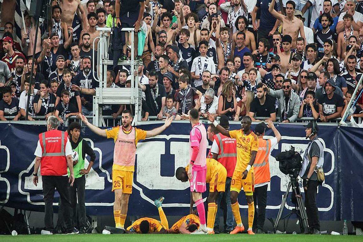 La fin de saison des Girondins de Bordeaux est décidément lunaire : après avoir été le concurrent le plus sérieux pour la montée en première division en occupant la première place pendant cinq journées, ils se retrouvent dans le flou. Le club girondin pourrait bien disputer une nouvelle saison dans l’antichambre de l’élite du football français. Après l’ouverture au score du club ruthénois par Lucas Buades à la 22 ème minute, un supporter bordelais descend des tribunes pour agresser le joueur durant sa célébration. L’arbitre en charge de la rencontre a immédiatement pris la décision d’interrompre, d’abord temporairement la rencontre puisque le joueur a été évacué en raison d’une commotion cérébrale. Le match a été mis en pause quelques minutes le temps d’une discussion entre les responsables de la Ligue de Football Professionnel(LFP), une décision en ressort, le match sera définitivement arrêté. Certains joueurs bordelais ayant compris que l’espoir de la montée s’éloignait encore davantage étaient revenus sur le terrain en larmes. Dans le même temps, le FC Metz l’emportait à domicile face à Bastia, qui attend néanmoins la décision officielle de la LFP pour fêter son maintien. La commission de discipline se réunira lundi matin.