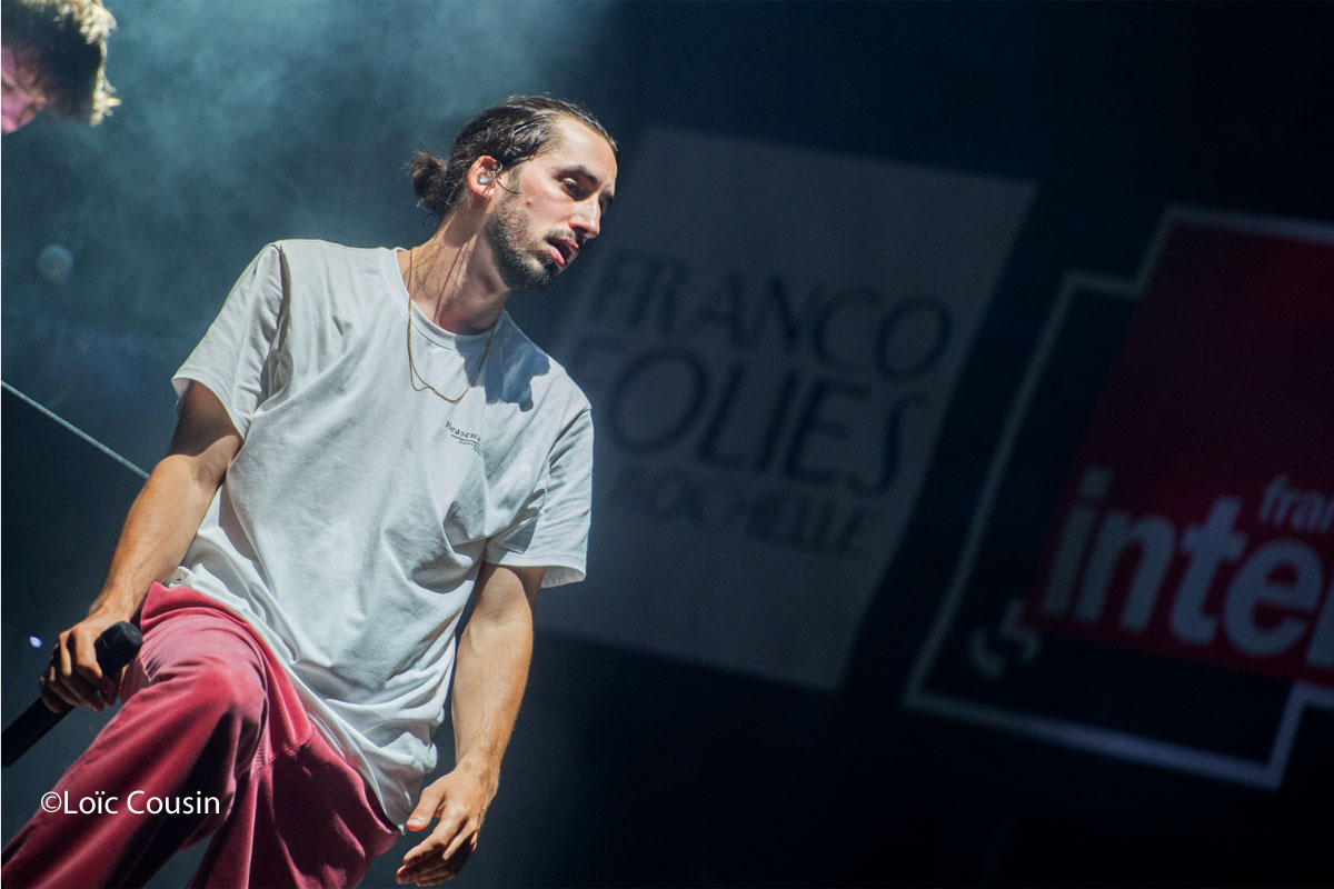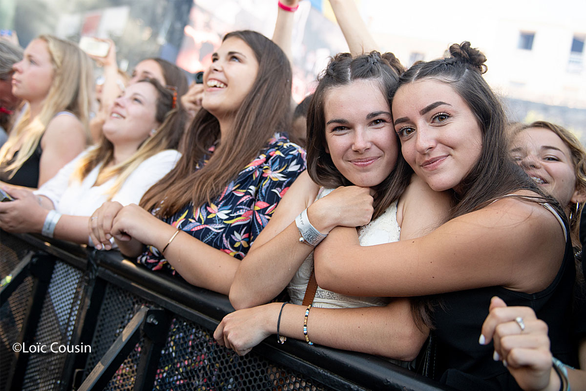 En plein coeur du centre ville, il fallait aimer le rap et l’auto-tune pour assister aux concerts du soir et c’est d’abord le groupe Columbine qui est venu, quelques jours après un passage remarqué à Garorock, mettre le feu devant un public incroyablement hystérique, et très jeune. Si il est certain que beaucoup ne sont venus que pour l’artiste suivant, les rappeurs bretons peuvent se réjouir d’avoir malgré tout de réels fans présents dans les premiers rangs connaissant par cœur les morceaux « Les prelis », « cache-cache », et la dernière chanson du concert « Adieu bientôt » . Souvent entre 13 et 18 ans, les festivaliers et festivalières se compressent l’un l’autre afin de s’approcher le plus possible des idoles dans l’espoir de toucher une main des chanteurs ou d’avoir juste un regard. Les 2 bretons Lujipeka, et Foda C, quittent la scène épuisés des sauts à répétition, et de l’énergie qu’ils ont laissé sur le bord de scène.