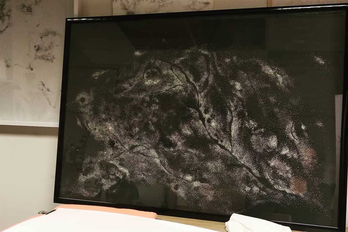 - Atelier de Charlotte Agricole au travail sur un dessin à l’aiguille
