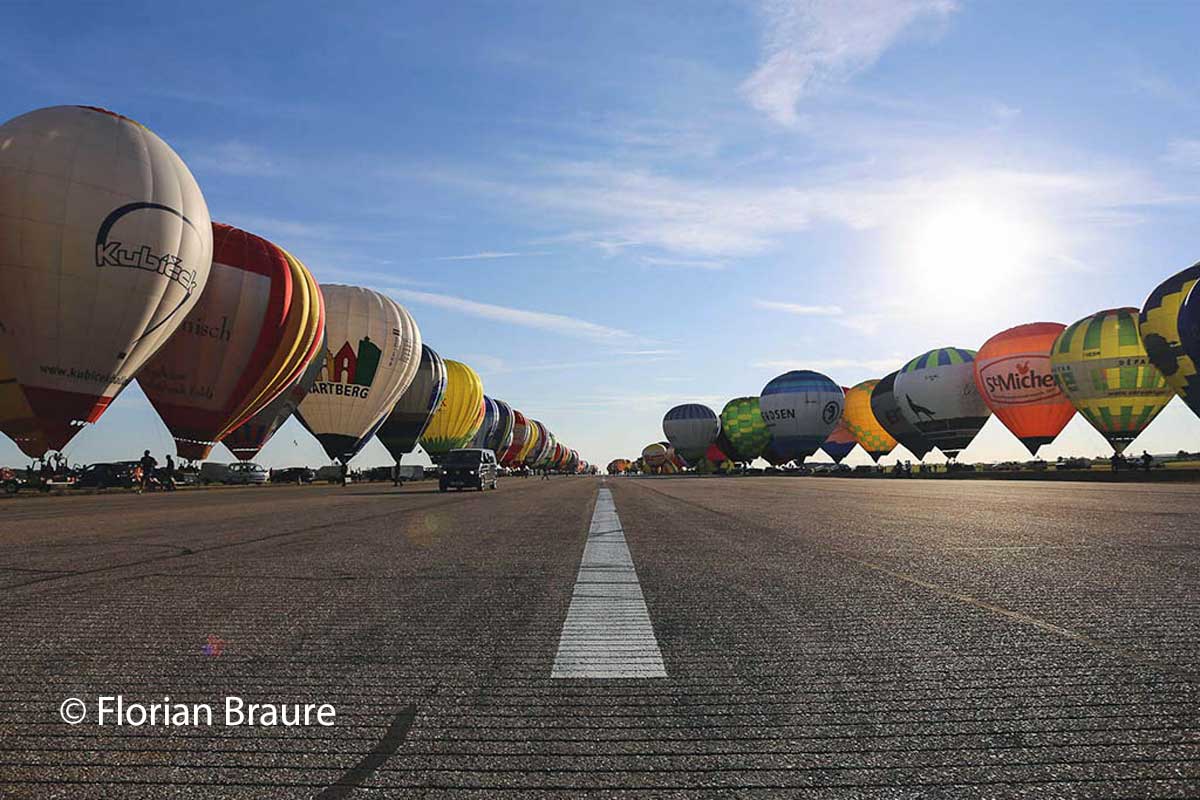 - Alignement de montgolfières le long de la piste principale de 2100 mètres de l’aérodrome de Chambley