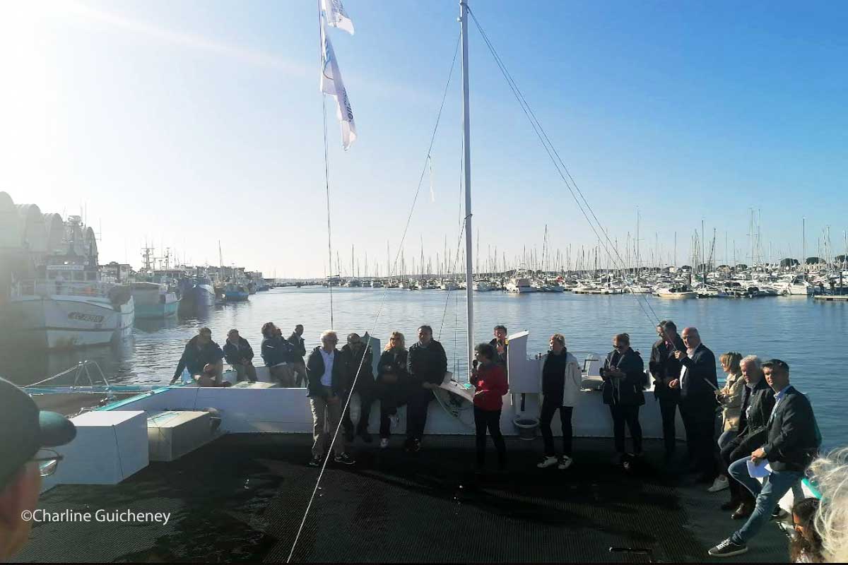 « C’est une cérémonie de baptême importante pour ce superbe navire, ce laboratoire de la traction par kite, en cette Journée mondiale de la Terre et sous le marrainage d’une grande navigatrice défenseure de l’environnement Isabelle Autissier. Nous allons procéder à cette belle tradition maritime afin de ne pas trop contrarier Neptune, dieu des mers et des océans. », annonce Marc Thienpont, directeur général de l’entreprise Beyond the Sea, depuis le catamaran.