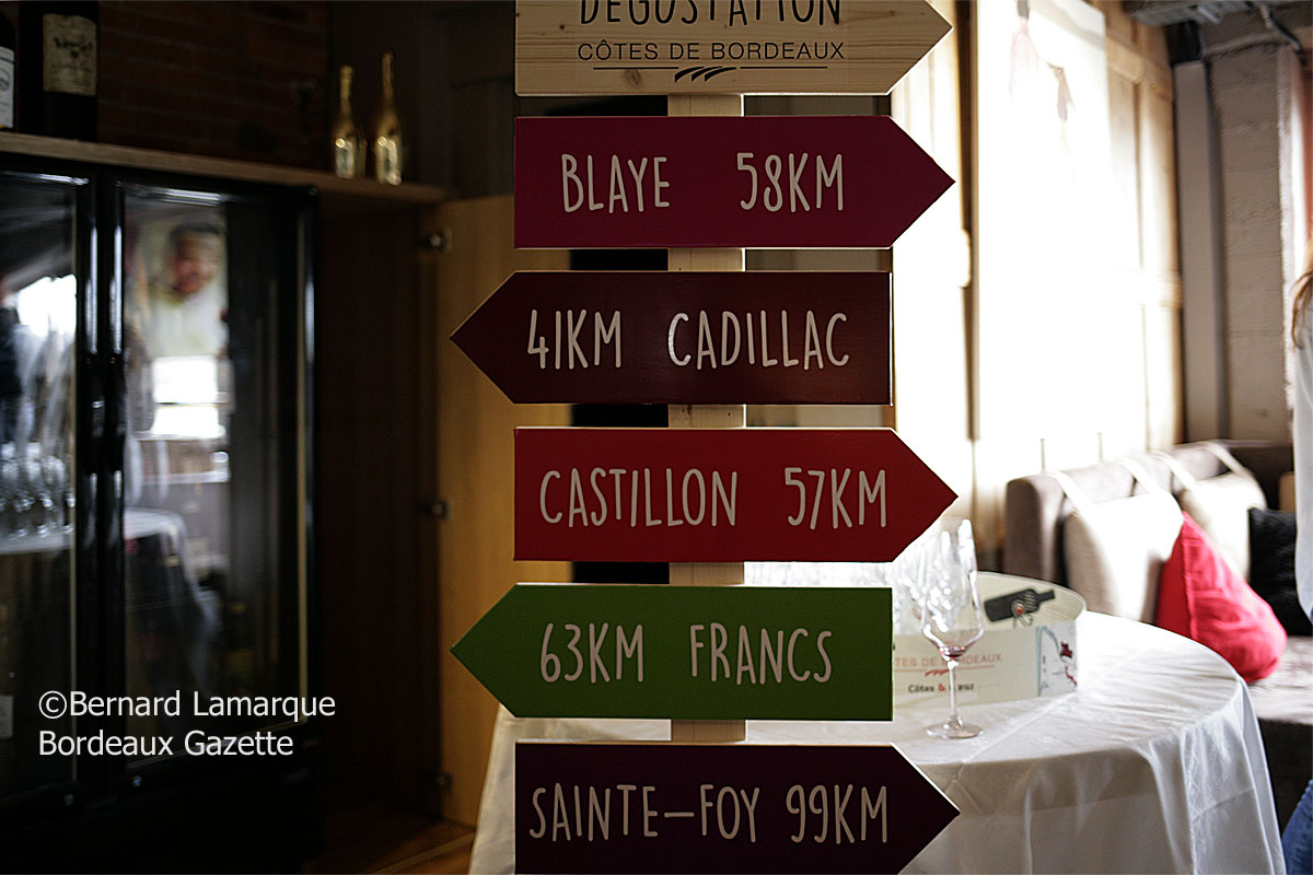 Pour cette dégustation étaient réunis de nombreux vins rouge Blaye, Côtes de Bordeaux ; Cadillac , Côtes de Bordeaux ; Castillon, Côtes de Bordeaux ; Francs, Côtes de Bordeaux ; Sainte-Foy, Côtes de Bordeaux ainsi que quelques vins Blancs secs de Sainte-Foy Côtes de Bordeaux et un Blaye Côte de Bordeaux. Pour corser l’affaire l’organisation proposait aussi des vins en vrac de Blaye et de Cadillac soit plus de cent vins différents, ou plus exactement cent dix neuf vins différents et il était bien difficile de tout goûter montrant bien la richesse de ces Côtes de Bordeaux qui sont nées en 2008 soit quarante après mai 68, démontrant le côté révolutionnaire de la création de cette AOC Côtes de Bordeaux qui réunit désormais les Vignerons de Blaye, Cadilac, Castillon, Francs et Sainte-Foy. Si on regarde bien que de la rive droite de la Garonne pour cette appellation nouvelle dont le merlot est le cépage roi avec principalement des rouges à 97% même s’il subsiste une faible proportion de blancs secs et liquoreux. C’est ainsi que s’est créée une appellation avec des vins de qualité à des prix accessibles qui aujourd’hui représentent une vente de 65 millions de bouteilles soit une sur dix produite en Bordeaux.