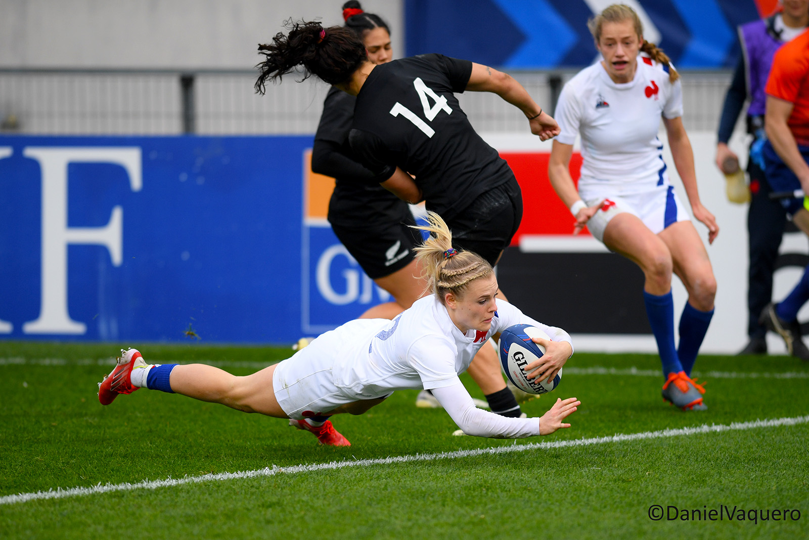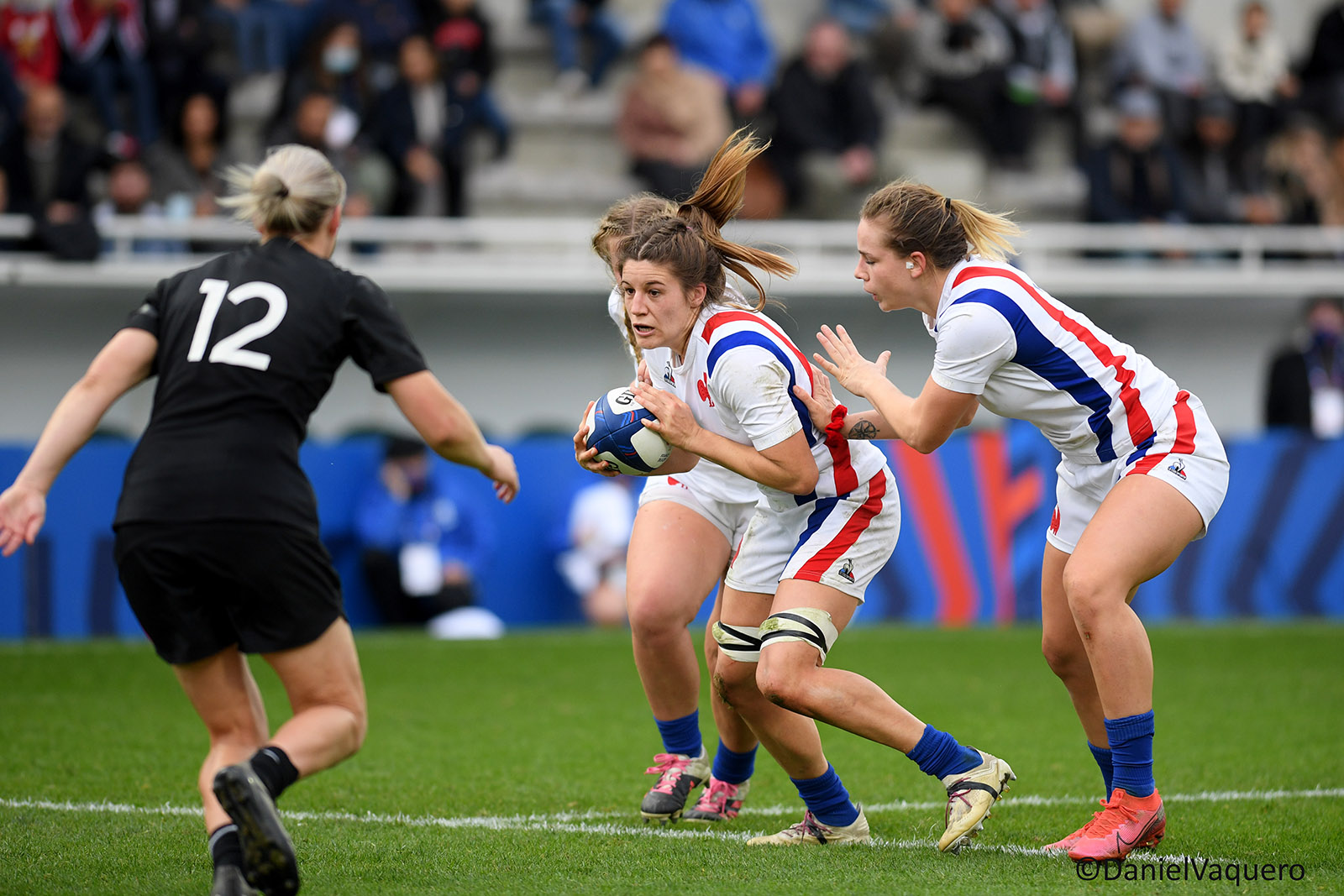 Pas question pourtant de bouder son plaisir ! Les 12000 spectateurs présents au stade du Hameau ne s’y sont pas trompés en encourageant sans répit et avec enthousiasme 80 minutes durant, ces françaises au jeu flamboyant. C’est Cyrielle Banet sur son aile droite qui rapidement allait concrétiser la domination française en inscrivant coup sur coup deux essais en conclusion d’actions d’école (10ème et 15ème) ; la jeune ailière très en vue dans ce premier acte aura mis par ailleurs et à plusieurs reprises au supplice la défense néo zélandaise.