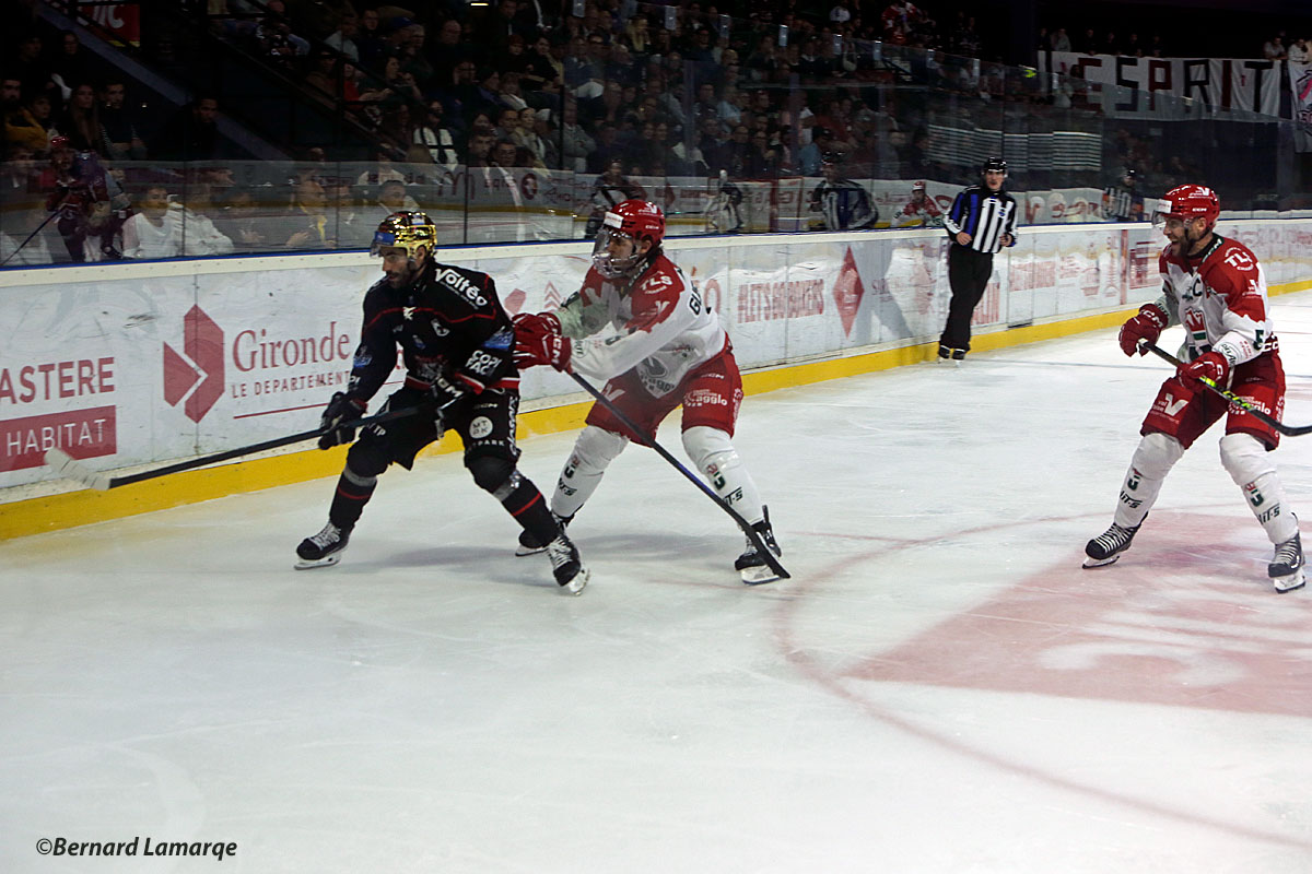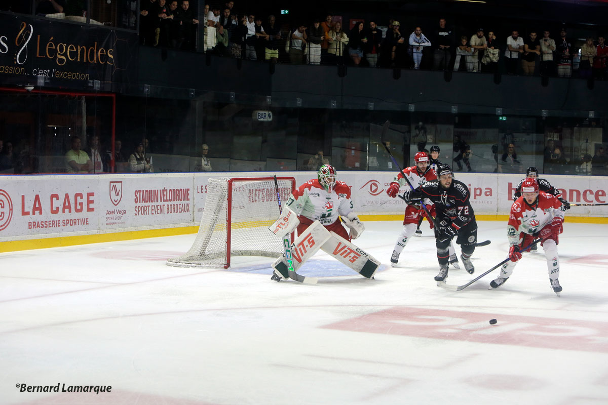 Pour la première sortie de Dubeau devant le public de Mériadeck ce dernier a bien tenu les clés de la cage et il s’en est fallu d’un cheveu que les Boxers ne blanchissent les Cergy-Pontins car ces derniers ont inscrit leur premier et seul but à quatre minutes de la fin, évitant de finir "cubi". Ce nom de Dubeau a quelque chose d’émouvant en rappelant cette publicité qui circule dans toutes les mémoires "Dubo, bubon, Dubonnet" car ce soir on vu Dubeau, du bon voire du très bon et ce nouveau portier a déclenché des salves d’applaudissements sur ses interventions régulièrement très efficaces. Il aura fallu attendre le deuxième tiers temps pour voir Pompei ouvrir le score pour les Boxers et on peut dire que ce lundi soir ce dernier a fait briller son casque doré de Top Scorer d’autant qu’il s’est offert une deuxième réalisation durant cette rencontre et durant la même deuxième période.