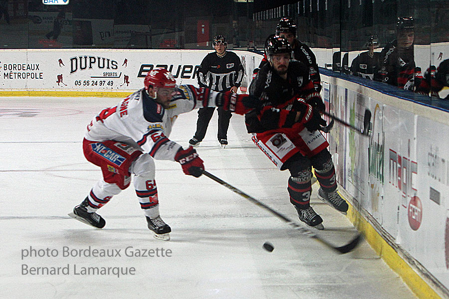Plus de 3.300 spectateurs à la patinoire Meriadeck pour suivre ce choc de la 18ème journée de Ligue Magnus entre les Boxers de Bordeaux et les Bruleurs de Loups de Grenoble qui a tenu toutes ses promesses avec un match engagé, très disputé et palpitant jusqu’à la dernière seconde. Match pendant lequel la plus grosse partie du temps les Boxers se sont efforcés de revenir dans la partie et ont réussi à coiffer leur adversaire au poteau, démontrant que les dieux du hockey étaient bordelais en ce soir Halloween ou certains n’avait pas hésité a se déguiser comme le photographe officiel des Boxers. Ce n’était pas la seule grosse affiche de la soirée car Gap recevait Rouen qui a triomphé chez les gapençais par 3 à 2, mais Gap à toujours 4 matchs de retard par rapport à Grenoble qui occupe toujours la première place avec 45 points devant Rouen et Bordeaux qui compte 18 matchs chacun et respectivement 41 et 35 points. Comme l’an passé le championnat se joue entre quatre équipes Rouen, Gap, Grenoble et Bordeaux mais cette année un petit cinquième pointe son nez avec Amiens qui n’est pas si loin que cela en nombre de points. Déplacement à Nice vendredi avant les dix jours de trêve internationale, le championnat reprendra pour les Boxers avec quatre déplacements consécutifs (Angers 14/11, Amiens 17/11, Épinal 19/11 et Chamonix 26/11)