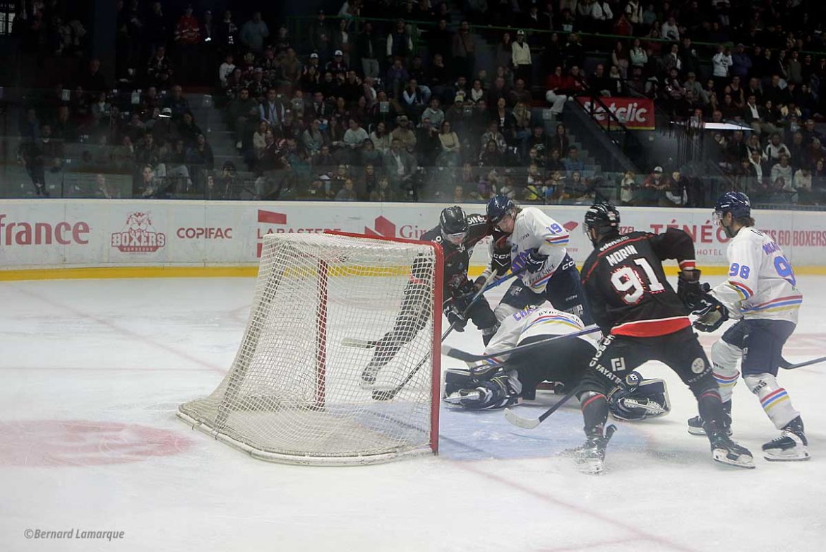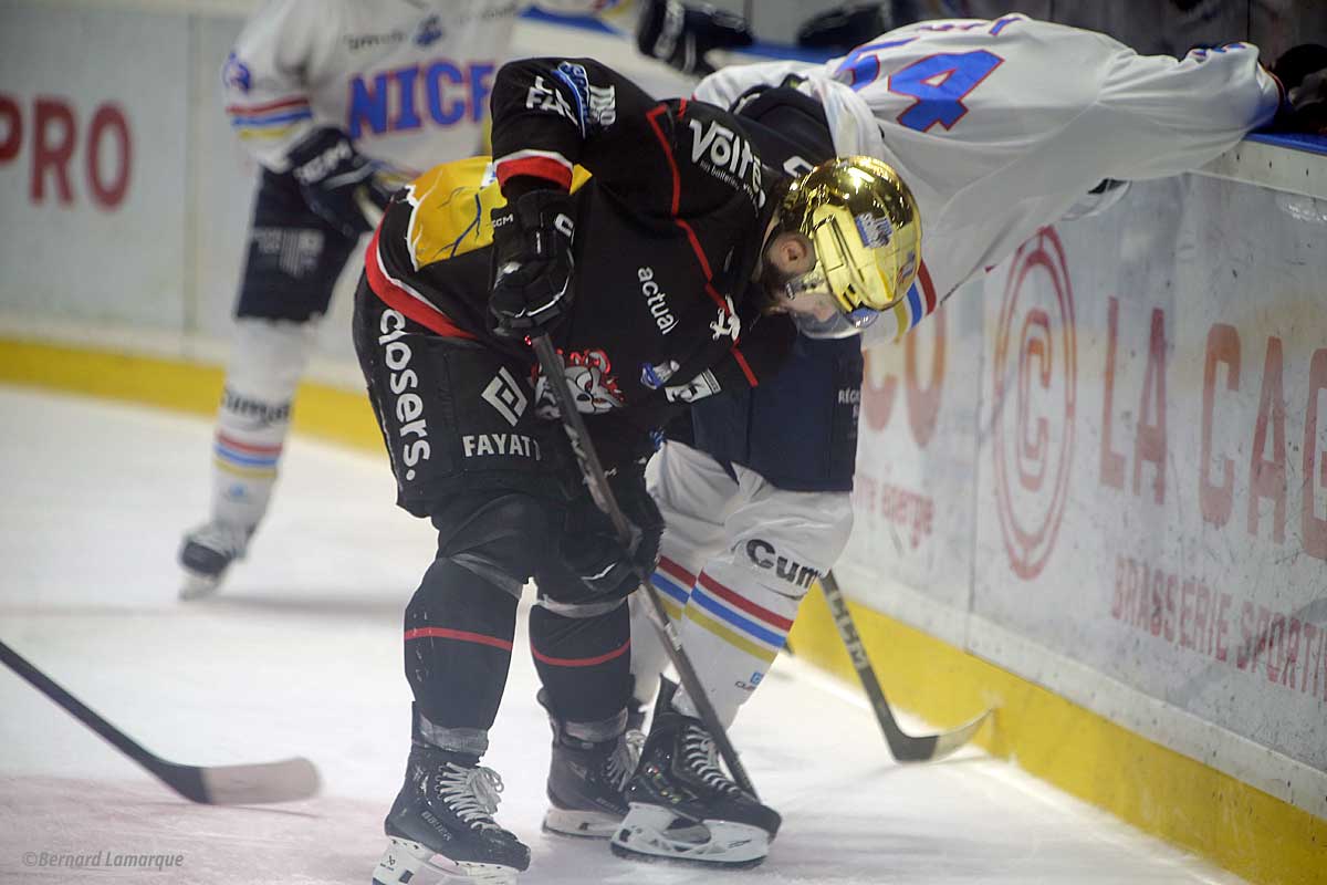 Au sortir de la glace on a vu des Niçois plutôt vexés de s’être fait battre car ils ont perdu leur troisième place et chutés deux fois à Meriadeck en quelques jours. Le match a été vigoureux en termes d’échanges cela allant même jusqu’à la boxe. Un Teemu Loiseau à Nice étant particulièrement agressif et toujours près à en découdre, il a soulevé des huées dans une patinoire chauffée à blanc pleine de 3 500 spectateur(e)s qui ont donné de la voix. La partie a très vite était engagée les Boxers inaugurant le score dès la troisième minute remettant cela trois minutes plus tard mais rapidement le jeu s’est équilibré avec des Niçois qui ont comblé une partie de leur retard avant la fin de la période. C’est le deuxième tiers temps qui a été le plus prolifique avec des Niçois revenant à égalité puis à nouveau les Boxers prenant le large pour mener un instant cinq à deux mais les visiteurs revenaient en partie au score à cinq trois avant la fin de la période.