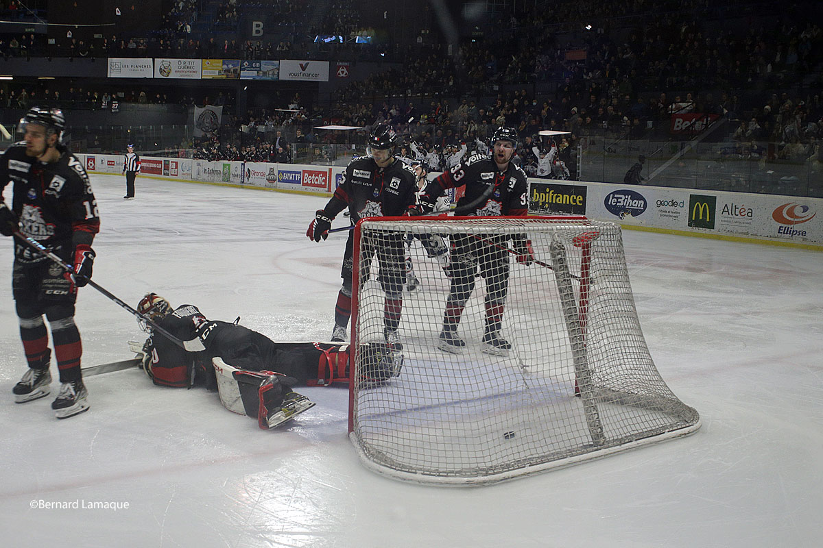 La première rencontre contre les Ducs d’Angers a été un véritable calvaire pour les Boxers qui ont encaissé six buts dans cette première rencontre de quart de finale avec une première période à deux buts, puis une seconde à un but laissant pointer un espoir de redressement et finalement une troisième avec trois buts supplémentaires encaissés alors que le public s’attendait à mieux. Le lendemain, soit Angers en avait garder sous la pédale, soit les Boxers avaient élevé leur niveau de jeu ce qui a donné une partie beaucoup plus équilibrée, seulement lâchée en prolongation. Il y avait quand même près de trois mille spectateurs pour soutenir les Boxers ce soir là pour ce second match. Dommage, une égalité en fin de ces deux premières rencontres auraient laisser un meilleur espoir pour la suite et maintenant déplacement à Angers pour les trois prochains matchs en espérant qu’il y en aura trois car dès qu’Angers a gagné quatre match il franchit l’étape des quarts de finale.