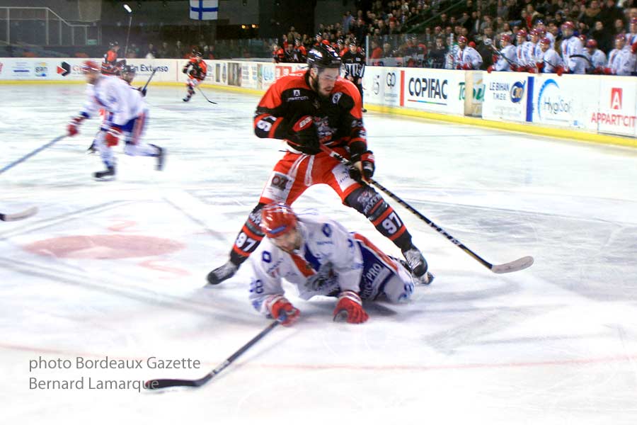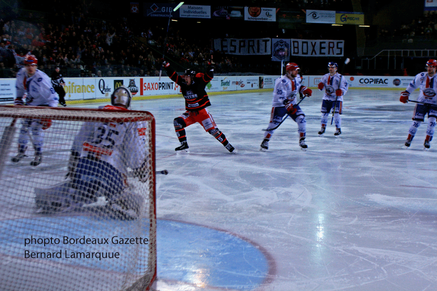 Mauvaise pioche que ce résultat négatif à Mériadeck car non seulement Lyon conforte sa quatrième place mais Amiens en battant Grenoble 5 à 4 s’empare de la cinquième place et relègue Bordeaux en sixième avec Angers qui se rapproche à quatre points et il ne faudrait pas basculer dans la zone des Play Down. On peut dire que les Boxers traversent une période difficile en championnat alors qu’en Coupe tout va pour le mieux. Maintenant prochain match en Coupe le 20 décembre à Dunkerque, Coupe qui a l’air de mieux leur réussir avec à chaque fois un tirage au sort plutôt favorable. Si le match a rapidement débuté pour les Boxers qui ont scoré d’entrée (0mn 30 sec), ils ne sont jamais arrivés à distancer les visiteurs qui sont toujours revenu au score comme à la fin du deuxième tiers temps ou le score était de 3 à 3. C’est sur le troisième tiers temps que les Lions se sont montrés un peu meilleur que la différence d’un petit but s’est faite.