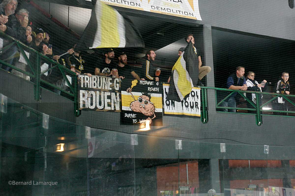 C’est un match à guichets fermés qui s’est déroulé à la patinoire et on a même vu des amateurs qui n’avaient pas eu de billet solliciter les arrivants pour savoir s’ils n’avaient une place à vendre. Les Dragons de Rouen avaient une revanche à prendre face aux Boxers et manifestement ils avaient préparé leur coup pour mettre le feu aux poudres et provoquer la bagarre et ils y sont parvenus. Il a fallu un long entretient de Marc André Levesque avec les arbitre avant le lancement de la troisième période pour que la rencontre devienne plus propre ce qui a permis aux Boxers de contrôler la période. Très mauvaise mentalité de ces rouennais qui n’ont pas besoin de cette manière d’agir plutôt anti-sportive pour faire la différence. Ils ont gagné certes mais d’une manière très moche et pas au service du hockey. On peut espérer que des sanctions tomberont suite à ces comportements provocateurs très désagréables et qui desservent un sport certes physique mais qui est encadré par des règle précises. En deuxième période le match aurait pu vraiment dégénérer avec l’attitude de certains joueurs de Rouen.