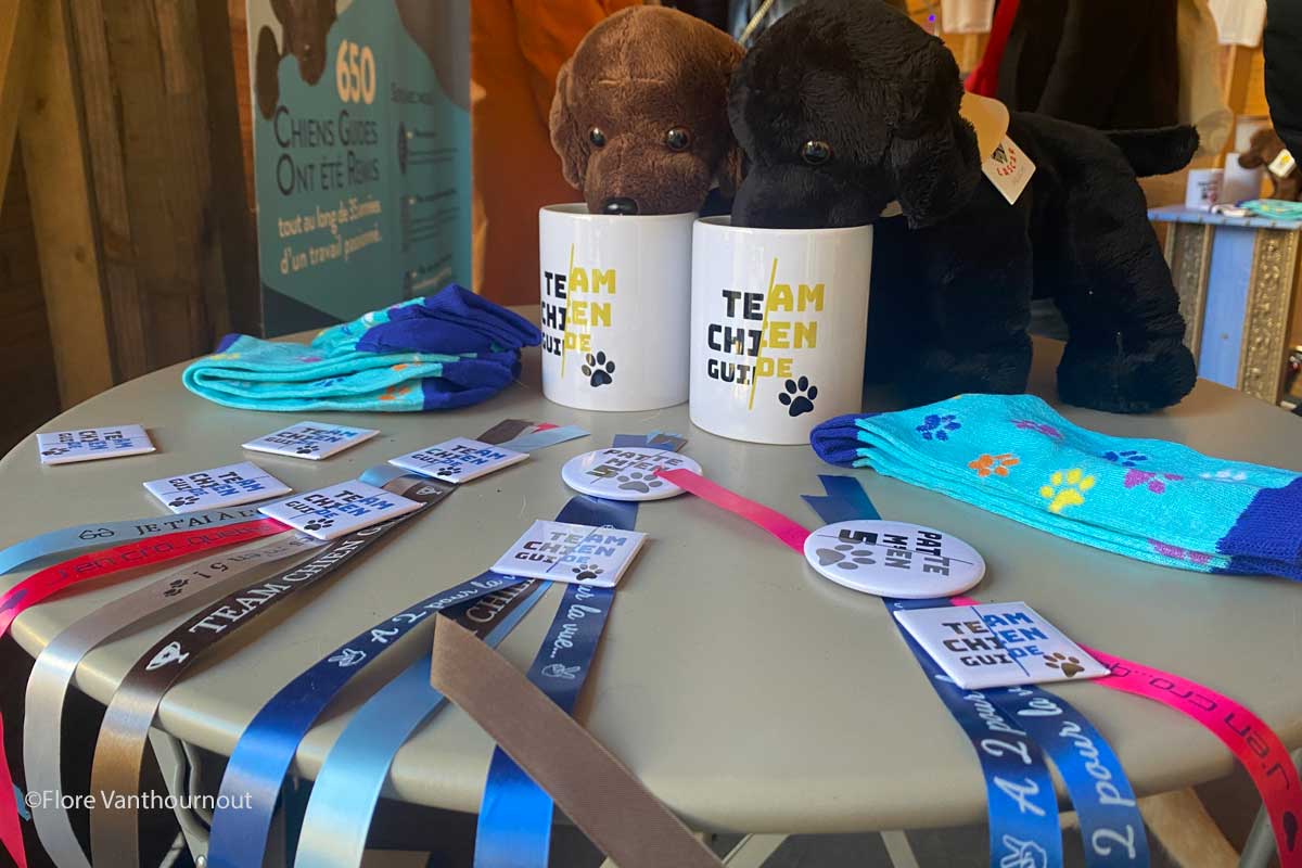 La présence de l’association au Marché de Noël présente aussi un grand rôle dans son avenir financier. En effet, elle ne bénéficie d’aucune subvention de l’état et vit alors grâce aux dons et à ses partenaires. Sur les lieux, de nombreux « goodies » à l’effigie des animaux et de l’association sont donc en vente, afin de contribuer à ses frais. Jean-Marie m’explique : « Nous, on remet les chiens guides gratuitement, ce qui est très important afin que toutes les personnes qui en ont besoin puissent en bénéficier. Mais derrière cela, il y a quand même des coûts importants : les charges, l’entretien des locaux, la nourriture, les soins des chiens et surtout la masse salariale de l’association. On pourra toujours aider les gens qui en ont besoin, et c’est pour cela qu’on existe. Mais il arrive que nous aussi, on ait besoin d’un peu d’aide à ce niveau ! ». Une dure vérité qui reste très importante à prendre en compte pour l’association Aliénor qui donnent beaucoup de son temps pour réaliser de si belles choses et accompagner, dans les meilleurs conditions possibles, les personnes en déficience visuelle.