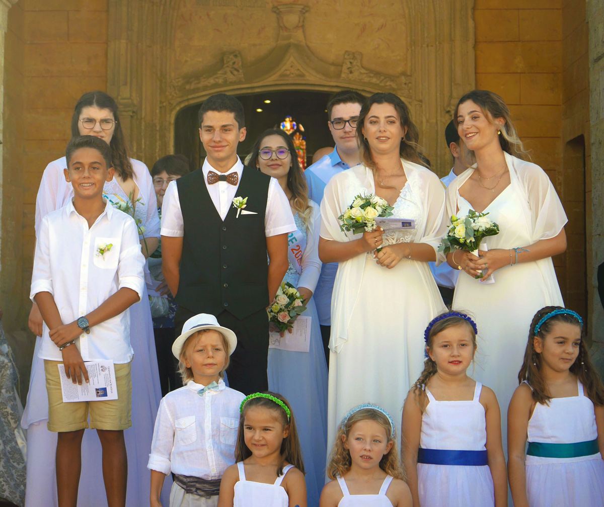 Ils avaient tous revêtu des costumes chics pour les garçons et de splendides robes blanches pour les filles, nous offrant ainsi une magnifique sortie de l’église. Un chapelet d’enfants chapotés et vêtus de blancs les accompagnait ; charmants petits anges réjouis dont certains malgré tout, n’avaient pas l’air très contents d’être là. L’amicale de Créon complétait cette ambiance, car tous portaient des costumes d’époque 1900 donnant à l’ensemble un caractère suranné et joyeux. Le généreux donateur Antoine-Victor Bertal n’aurait sans doute pas été dépaysé s’il avait surgi du passé au milieu de ces réjouissances. Le maire Pierre Gachet vint se joindre à la fête en posant avec fierté avec nos jeunes élus.