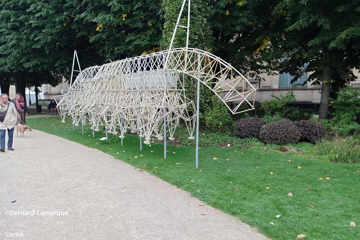 Les Strandbeests sont normalement des structures destinées à se déplacer et particulièrement sur les plages du côté de La Haye au Pays Bas sur les immenses plages de sable blanc balayées par le vent qui permet de les animer. Les Strandbeests surnommées les sculptures du vent car telles qu’elles sont conçues sont destinées à être animées par le vent qui souffle sur les Côtes des Pays Bas. Les Strandbeests sont réalisés à l’aide de tubes plastiques et de bouteilles. Ces tubes en plastiques sont initialement utilisés pour des installations électriques spécifiques, que l’on ne peut trouver qu’en Belgique ou aux Pays-Bas. Les premières structures créées par Théo Jansen n’étaient pas mobiles mais c’est au cours du développement de ses recherches que ses structures sont devenues cinétiques. Aujourd’hui on peut observer d’imposantes Strandbeests d’un mètre voire de plusieurs mètres peuvent se déplacer indépendamment mais vous n’aurez pas l’occasion de les voir se déplacer car elles sont statiques dans le jardin de l’Hôtel de Ville. Les tuyaux en PVC reste le matériau de base, mis grace à toutes sortes de techniques ingénieuses elles peuvent grâce au vent se déplacer de manière autonome.