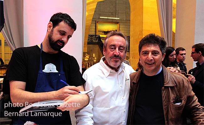Grosse affluence aussi pour ce Palais des Afamés animé par José Ruiz qui a passé son après-midi à interviewer les dix-neufs chefs présents autour d’un noyau très girondin en leur demandant leurs produits préférés le sens de la création de ces bouchées pour "Afamés" et à base de quoi elles étaient préparées. Que l’on ne se trompe pas les Afamés sont l’Alliance de Friands Amateurs de Mets Épicuriens et Savoureux et ont tous une vision identique de leur métier : sincérité, transparence, fraîcheur des produits et cuisine de marché. On pouvait se procurer sur place le livre "L’inventaire gourmand du Sud-Ouest" et Matias Mercapide livre en main s’est empressé de le faire dédicacer par les chefs présents et on susurre que notre ami Matias pourrait faire irruption sur la toile avec un site gourmand de très grande classe à l’image de ce qu’il sait faire en maroquinerie. La monnaie S.O Good a séduit par sa facilité d’utilisation et sa souplesse, l’innovation est vraiment de taille et suprême facétie à chaque fois que l’on glissait un jeton dans la boite les serveurs y allaient d’un savoureux "A voté".