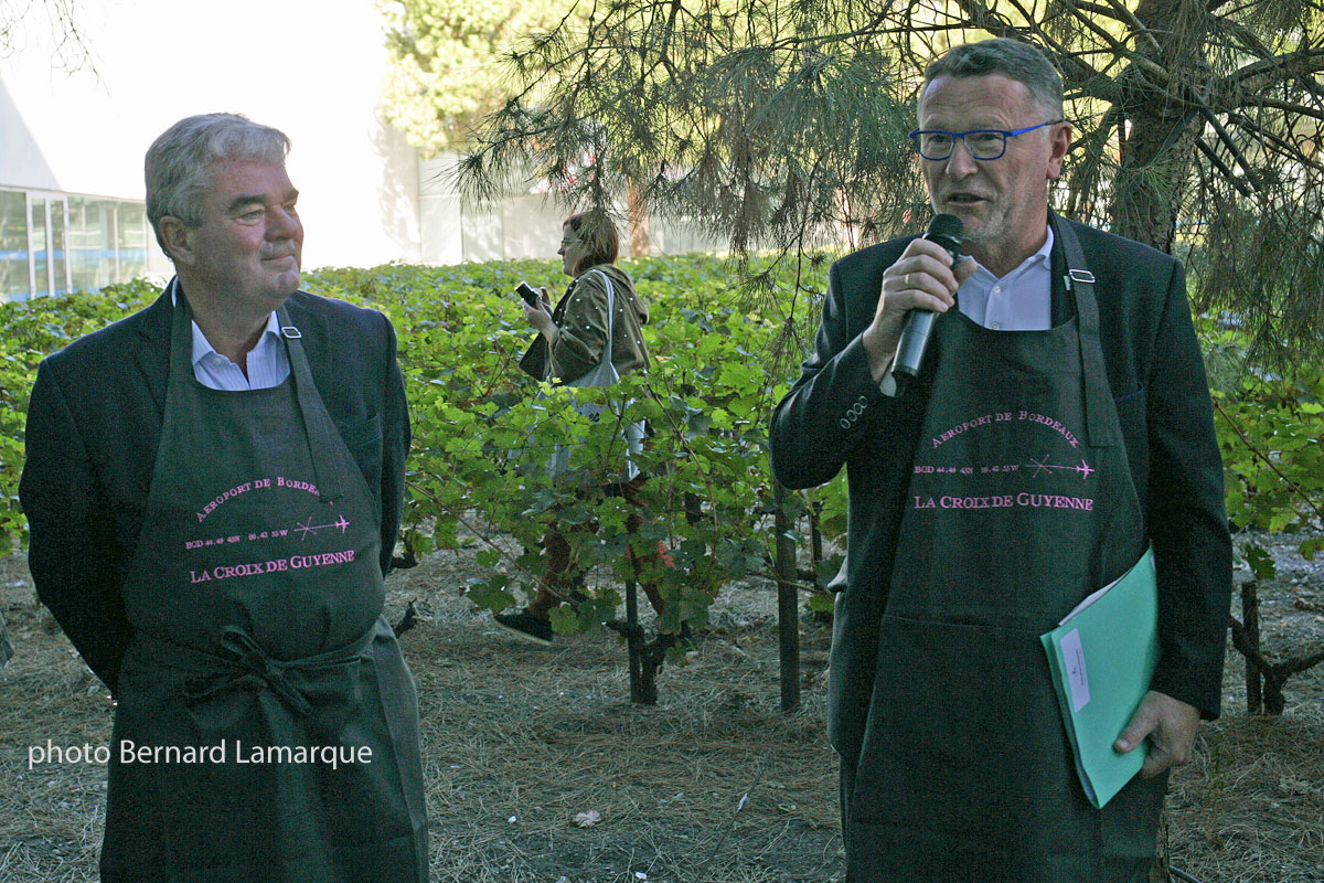 L’Aéroport de Bordeaux est le seul aéroport à avoir un vignoble dans son enceinte dont les coordonnées sont assez symboliques pratiquement à la croisée du 45ème parallèle et du Méridien de Greenwich (exactement BOD* 44,49 43N et 00,42 45W) lui donnant une position remarquable qui est à quelque chose près la position de Bordeaux. Ce vignoble est particulièrement protégé par les bâtiments de l’aéroport qui lui font une niche où il ne gèle pratiquement jamais. Le lieu est aussi planté de pins montrant bien les deux richesses de la région la vigne et la foret. Comme l’a rappelé Olivier Bernard qui s’occupe de ce vignoble en parallèle du Domaine de Chevalier au départ en 1998 le défi était osé car le sol du lieu qui s’appelle Beaudésert avait été un peu bousculé sur guère plus d’un mètre, mais la vigne aujourd’hui va chercher loin sa subsistance dans ce sol de grave de cinq à sept mètres et on y trouve toutes les qualités de ce vignoble du même nom. Le choix de départ a été de planter comme dans les grands crus du bordelais à 10.000 pieds/hectare avec du merlot et du cabernet. Patrick Seguin avait souligné que le fait de se retrouver pour cette vendange était une fête pour la CCI de Bordeaux qu’il a présenté en spécifiant qu’en Gironde elle s’occupe de 77.600 entreprises. La Chambre de Commerce c’est la maison des entreprises avec 10 antennes sur le territoire de la Gironde et "il ne faut pas avoir peur de se rapprocher de la pompeuse maison de la place de la Bourse"