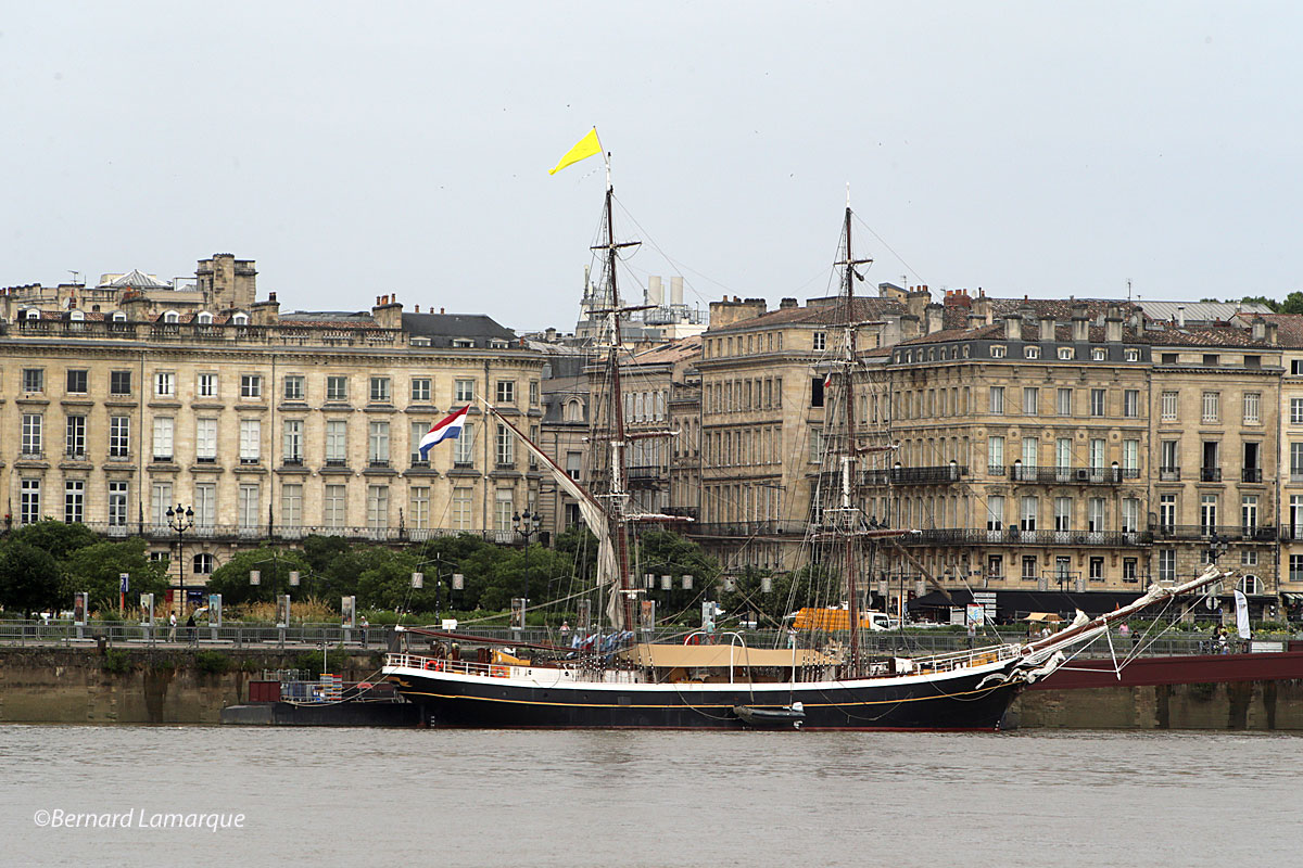 Le quatrième grand voilier, un peu isolé des trois autres est le Morgenster qui se trouve au ponton Jean Jaurès et qu’on peut visiter lui aussi. C’est un Brick deux mâts de 48 mètres de long avec un tirant d’air de 28 mètres, Ce brick hollandais « Vrou-Maria » (nom originel), est construit en 1919 à Scheveningen aux Pays-Bas construit dont la coque et le pont sont en acier. Il a participé à la Tall Shipps’ Regatta 2018 avec son étape Dublin Bordeaux et il vient de participer aux Fêtes Maritimes de La Rochelle du 19 au 23 juin. Il est resté bateau de pêche en Mer du Nord tout au long de sa vie jusqu’en 1970. Il avait été rebaptisé déjà Morgenster en 1959 mais, son activité s’est diversifiée à partir de 1970 pour s’illustrer dans la pêche sportive et il a même un moment hébergé une radio libre. Il peut embarquer jusqu’à 36 personnes en croisière, c’est un voilier traditionnel qui allie détail traditionnel et luxe contemporain. Racheté en 1993 par Harry Mutter, il est magnifiquement restauré au fil des années et représente un réel intérêt pour la visite. Comme chaque année les voiliers partent trop vite au goût des festivaliers qui aiment regarder ces magnifiques bateaux en dégustant du Bordeaux et même parfois en buvant de l’eau car quand il fait très chaud cela permet de rester en forme. Des abreuvoirs sont ainsi disposé le long des quais et si on pense avoir un peu forcé la dose, on peut toujours faire tester son taux d’alcoolémie car il y a un stand pour effectuer cette recherche.