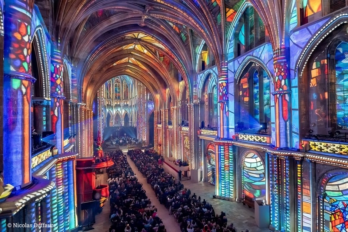 Cette expérience repose sur une composition sonore élaborée par Paul Lecomte, spécifiquement conçue pour être spatialisée grâce à 22 enceintes disposées autour du public confortablement installé dans la nef. Grâce à cette technologie 3D, l’audience bénéficie d’une immersion sonore inédite, permettant aux voix et aux percussions de parcourir l’édifice en parfaite symbiose avec les projections visuelles. Cette composition contemporaine tire son inspiration des musiques classiques et sacrées qui ont laissé leur empreinte tout au long de l’histoire de la cathédrale, édifiée au XVIème siècle.