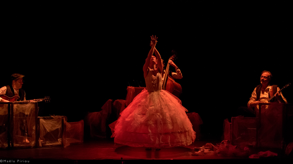 Une jeune femme surgit dans le théâtre, elle est étrangement vêtue d’une grande robe de bal à froufrou qui a beaucoup vécu puisqu’elle est en partie déchirée ; cette créature bizarre ; Madame Paule, moitié princesse pauvre et moitié vagabonde est une femme meurtrie qui vit dans la rue. Elle est d’origine slave en en a la nostalgie et la fougue, mais ne crache pas sur la vodka. Elle a connu l’amour, le chagrin, une enfance dont je vous laisse la primeur de la découverte puisque tout au long du spectacle elle va décliner avec ses entités le parcours sinueux de sa vie. En effet, elle n’est pas toute seule dans sa tête elle cohabite avec trois personnalités joyeuses ; un guitariste , une contrebassiste et une violoniste. Mais cette drôle de Cendrillon n’est pas un ange...