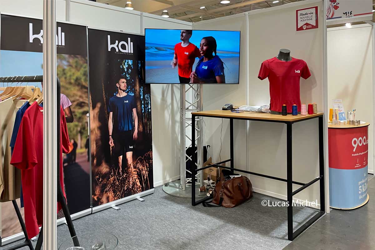 Le stand Kali se distingue au milieu des autres stands : il s’agit de la seule marque de sport du salon. Elle a célébré son lancement le vendredi 11 mars, pour l’ouverture du salon. Tout un symbole pour cette entreprise bordelaise. Kali est une marque de vêtements de sport fabriquée à partir de bouteilles de plastiques recyclés. « L’objectif est de rendre accessible des vêtements de techniques à bas prix », nous explique Théo Lapouge, l’un des fondateurs et lui-même athlète de haut niveau. Résistants, légers et ultra-respirants, avec le moins de couture visible possible, le design des tshirts et cuissards sont fait pour être le plus simple et efficace possible. « J’ai eu cette idée il y a environ sept mois, elle se concrétise ce week-end. Les précommandes sont ouvertes et les livraisons vont commencer début mai. On est très content des premiers chiffres et des retours sur le salon ».