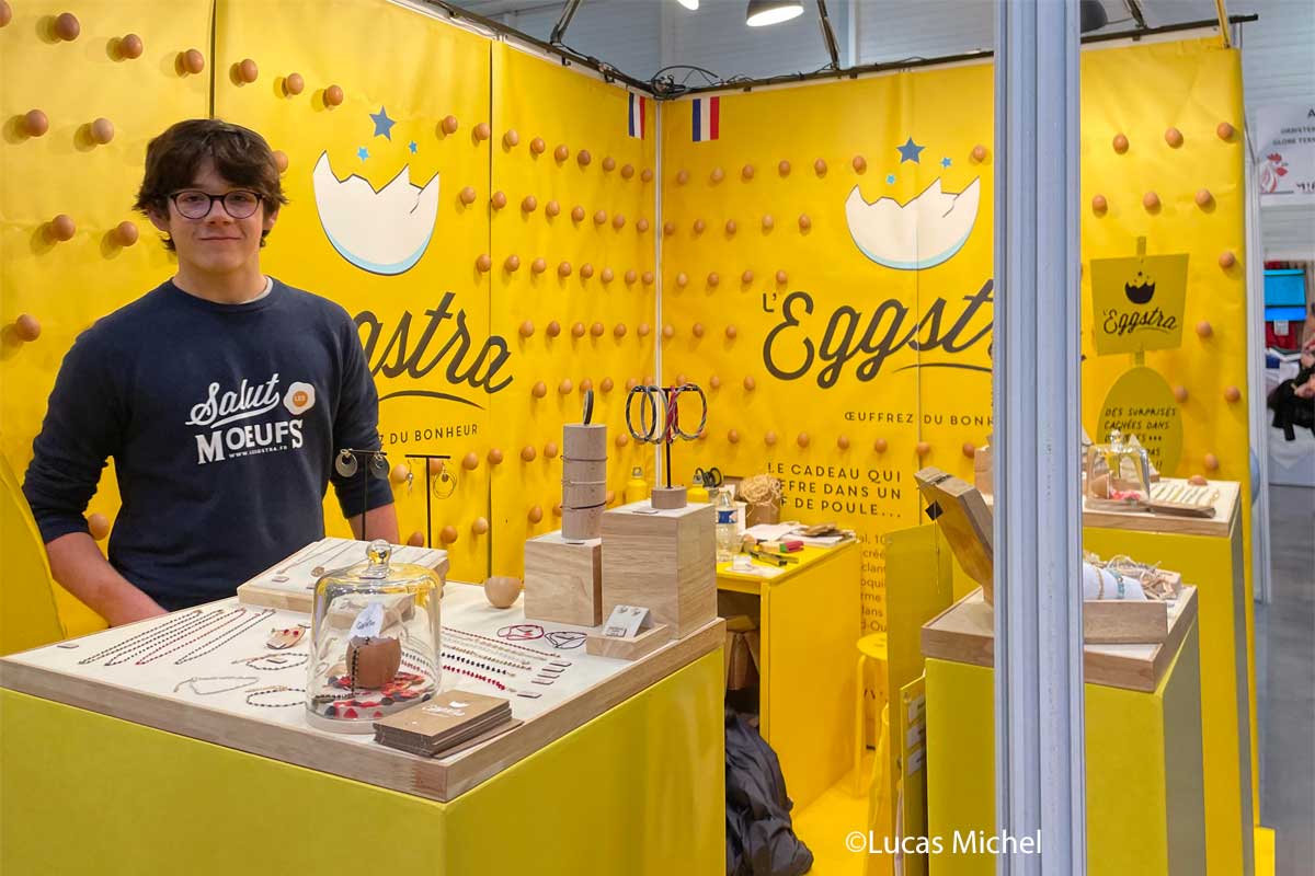 « Oeuffrez du bonheur ! », c’est le slogan de l’Eggstra, un concept marrant et surprenant. Vous l’aurez compris, l’œuf est l’élément essentiel. L’idée est d’offrir un cadeau contenu dans un véritable œuf de poule, vidé et totalement reconstitué au point de ne pas se douter qu’il ait déjà été ouvert. Le blanc et le jaune d’œufs partent vers des pâtissiers et traiteurs locaux. Pendant ce temps, la coquille, elle, sert de « papier cadeau » afin d’y glisser des surprises disponibles sur la boutique en ligne, dont des jolis bijoux que fabrique également l’eggstra. Tout est fait chez eux donc, dans le Lot-et-Garonne. L’idée est venue à Carole en 2013 et elle présente ses créations sur son stand décoré de dizaines d’œufs avec sa fille.