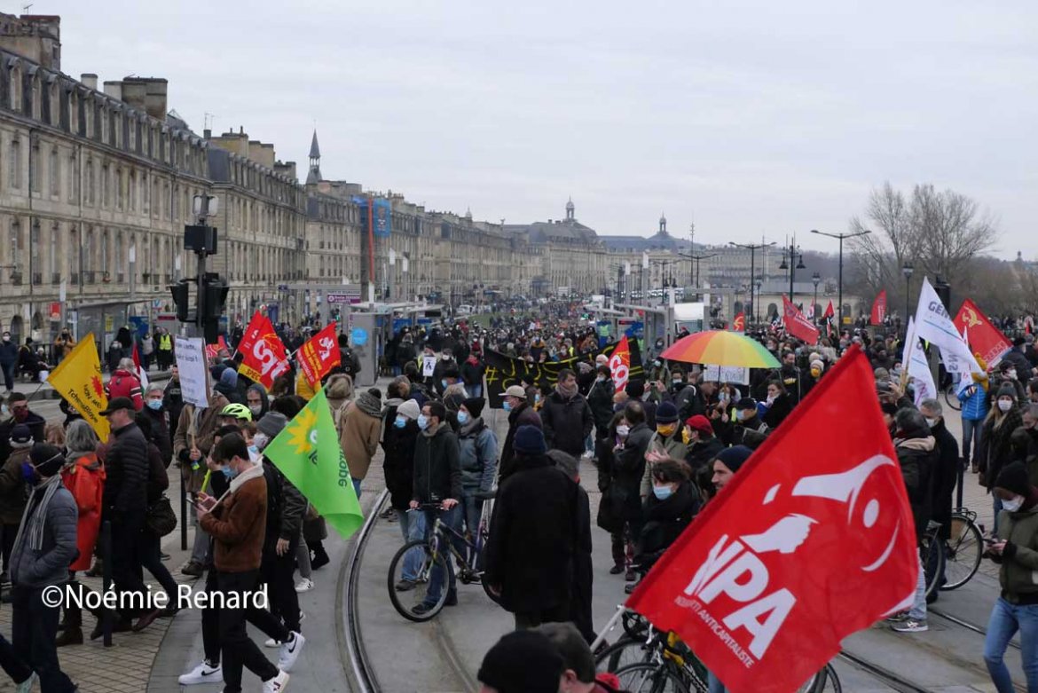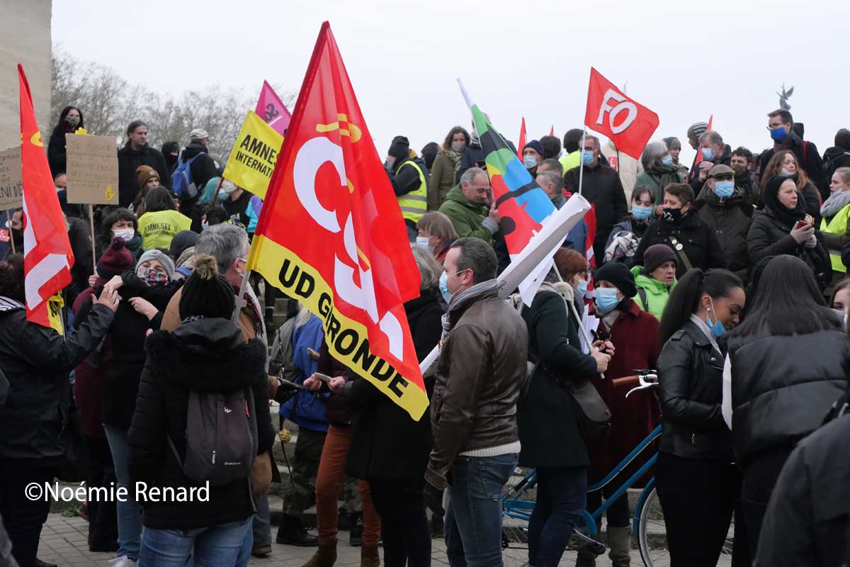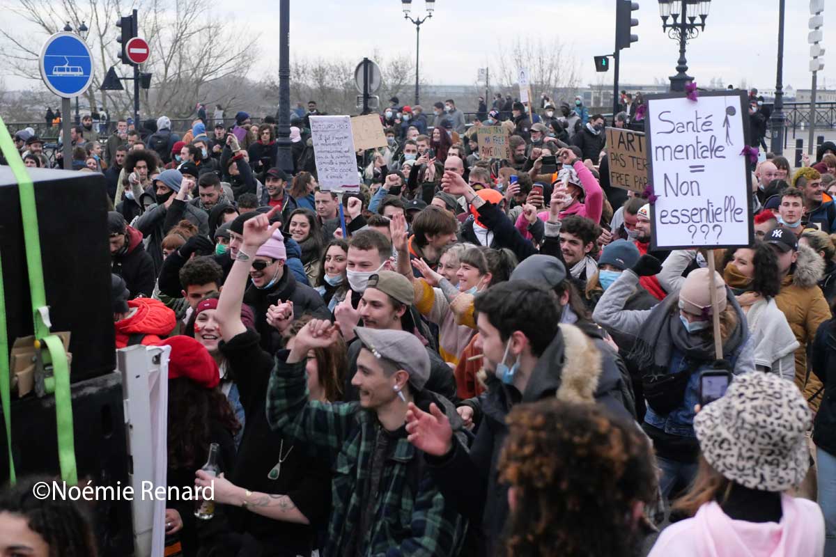 Samedi 16 janvier, près de 4 000 personnes se sont rassemblées suite à l’appel à manifester par plus de 30 syndicats. Ils se sont élancé dans les rues de Bordeaux vers 14h30, tout en évitant l’hypercentre suite à l’interdiction d’y manifester par la préfecture de Gironde. Deux cortèges ont ainsi déambulé de Quinconces à place de la République : en tête, le cortège syndical, suivi par des milliers de jeunes et membres de la mouvance « free parties ».