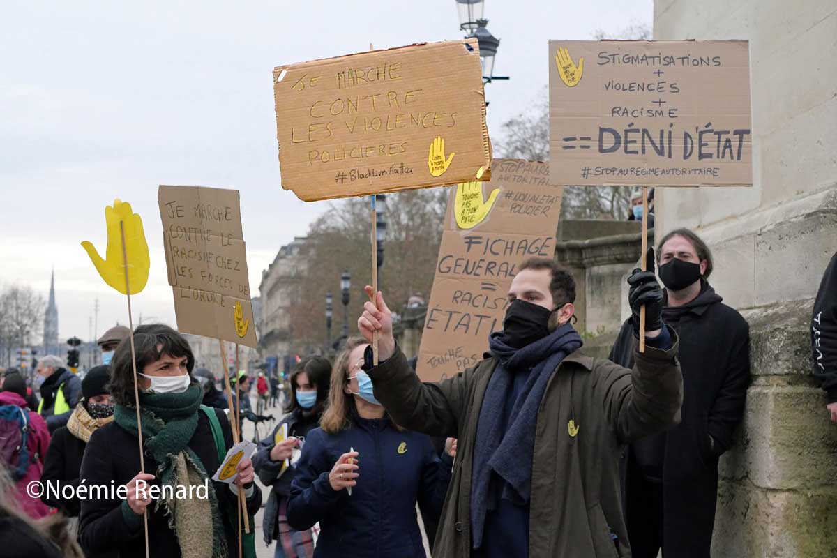 L’appel à manifester de plus de 30 syndicats et associations sur Bordeaux aura su faire écho ce samedi. Des milliers de Bordelais se sont rassemblés, pour un rendez-vous prévu place des Quinconces coté quais (partie de la place autorisé par la préfecture). Partis défiler une trentaine de minutes plus tard, CGT, FSU et FO se sont, comme souvent, retrouvés en tête de cortège. Sur Antisocial de Trust, ils clament des slogans. On a pu entendre, par exemple : « Lallement démission, Darmanin en prison ». Cette manifestation pour la démocratie et les libertés était suivie de près par de nombreuses associations. Étaient notamment présents SOS Racisme, la Ligue des droits de l’Homme, Amnesty International, le Club de la presse de Bordeaux ou encore Greenpeace. Le tout accompagné de quelques Gilets Jaunes toujours en action et de quelques partis politiques majoritairement de gauche. Ces manifestants demandent le retrait de l’article 24 de la Loi Sécurité Globale, qui vise à interdire la diffusion d’images des forces de l’ordre si elles ont pour but de nuire à leur intégrité, mais aussi le retrait des articles 21 et 22, qui envisagent respectivement l’utilisation de caméras-piétons des forces de police et l’utilisation de drone de surveillance dans les missions de maintien de l’ordre et de lutte contre le terrorisme. Ces lois interrogent et surtout inquiètent, souvent qualifiées de lois liberticides. On pouvait notamment lire sur les pancartes : « Etat policier ». Dans une marche pacifique, on pouvait cependant sentir la colère grondée, avec la volonté de faire opposition à toute disposition élargissant la surveillance de masse ou faisant reculer le droit à l’information. Le décret du 4 décembre 2020, visant à élargir les possibilités de fichage en intégrant possiblement les opinions politiques, les convictions philosophiques et religieuses, les déplacements, les pratiques sportives ou même les activités sur les réseaux sociaux était donc aussi défendu lors de cette marche des libertés.