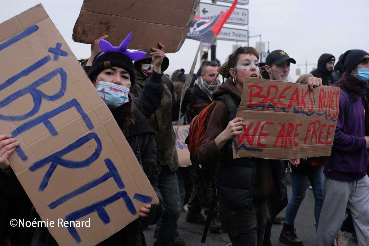 Pendant ce temps, la jeunesse se retrouve en queue de cortège. Si une partie d’entre eux s’opposait aussi aux articles de la Loi Sécurité Globale, beaucoup d’autres étaient ici pour défendre la culture et le droit au divertissement et à la fête. Rejoints par les teuffeurs de la mouvance « free parties », ils étaient des milliers à danser, bière à la main, en avançant au rythme des Sound system qui étaient au nombre de 3 ou 4, sans réels gestes barrières. Beaucoup étaient là pour condamner une « répression disproportionnée » lors de la rave party de Lieuron en Bretagne ce 31 décembre dernier et qui avait réuni 2400 personnes malgré les restrictions du gouvernement pour la Saint-Sylvestre. Un nom est revenu sur les pancartes et dans les bouches : Tristan. Ce jeune de 22 ans, « actuellement en prison pour avoir fait danser des gens » est suspecté d’être l’organisateur présumé de cette rave illégale. Il risque jusqu’à 10 ans de prison. Jeremy, à la tête d’un des Sound system s’exprime : « Toute la France se révolte aujourd’hui. On met Tristan en prison pour avoir organisé une fête et, pour bien plus grave que ça, des criminels sont laissés en liberté. On pose des basses, on ne pose pas des bombes. Et les personnes qui sont là sont des personnes qui cherchent un moment de liberté. » Ce mot, liberté, était inscrit sur presque toutes les pancartes. Chacun en a sa vision et sa définition, mais une chose et sûr, tout le monde la recherchait en ce jour de manifestation. A l’heure où la Covid-19 inquiète le monde et ses systèmes de santé, ces jeunes (mais pas que) se soucient de l’impact psychologique de ce virus. A fermer les bars, les restaurants, les cinémas, les théâtres, les concerts, le gouvernement « fait primer l’économie sur la culture et le bien-être de sa population ». Cette foule festive est arrivée à la Victoire vers 15h30 avant de terminer sa marche Place de la République comme prévue. Vers 17 heures, les musiques ont cessé et après quelques annonces au micro (notamment le fait de ramasser ses déchets), les groupes se sont dispersés afin d’être rentré avant le nouveau couvre-feu national à 18h. Malgré cela, quelques dizaines de jeunes ont tenté de s’engager dans la rue Sainte-Catherine, immédiatement arrêtés par les forces de l’ordre. Malgré quelques lacrymos, la soirée s’est terminée sans embûches, sans blessés ni interpellations.