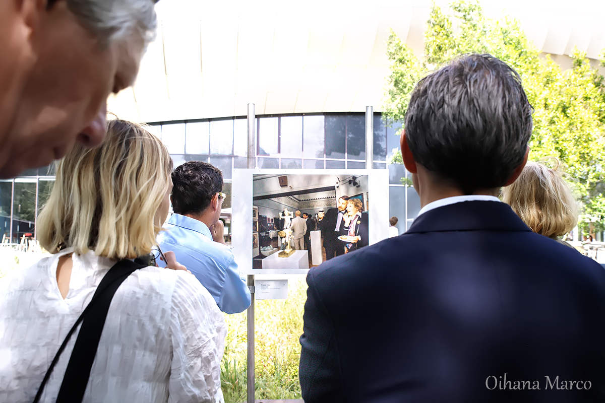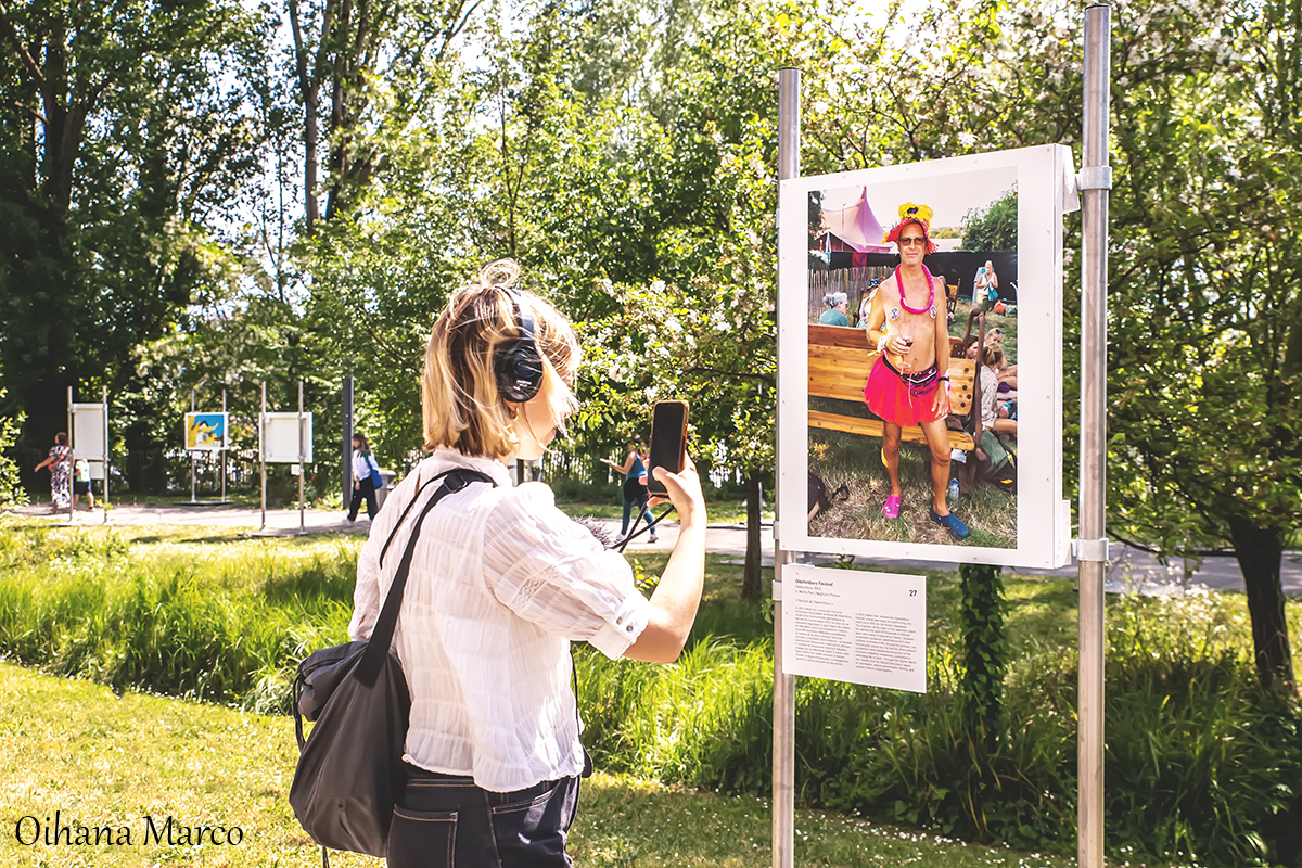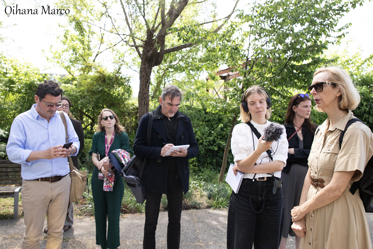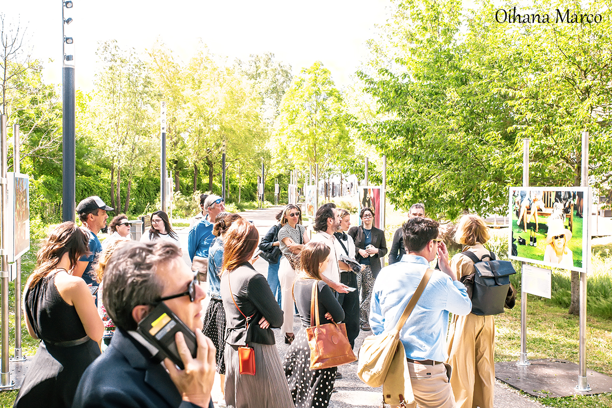 - La visite guidée rassemble les regards autour des images. Dans cet accrochage extérieur, les photographies ne sont pas isolées : elles cohabitent avec les visiteurs, la lumière et les jardins.