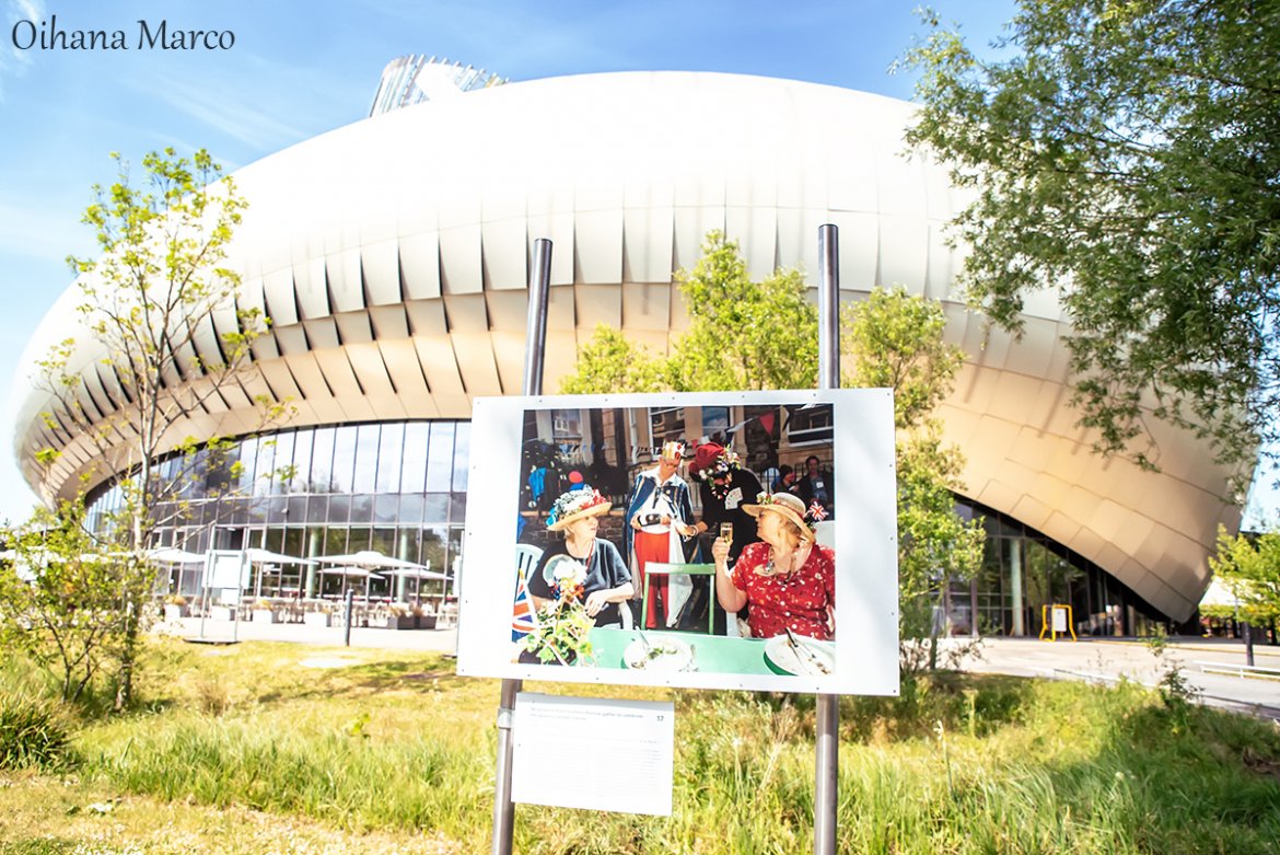 Il y a quelque chose de très juste à découvrir Martin Parr dehors. Pas dans le silence contrôlé d’une salle d’exposition, mais au milieu des arbres, des passants, du soleil, des discussions et des gestes ordinaires. Dans les jardins de la Cité du Vin, ses photographies ne sont pas seulement regardées : elles sont traversées, croisées, parfois presque rejouées par celles et ceux qui passent devant elles.
