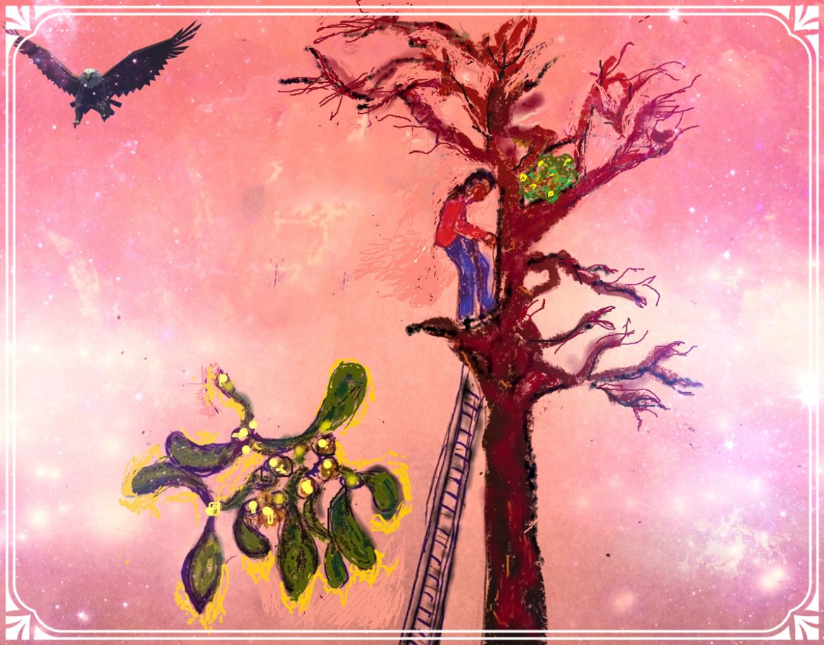 Dylan scrutait la cime de l’arbre avec une attention toute professionnelle. Son but se trouvait tout en haut ; son travail ; élaguer les branches annexes du tronc qui n’avaient plus rien de vivant. Les feuilles avaient déserté le grand chêne et son grand squelette s’étirait vers le ciel à presque une dizaine de mètres au-dessus du sol. Déjà équipé, Dylan en vrai spécialiste vérifia mentalement s’il n’avait rien oublié ; harnais de sécurité, griffes d’élagage, longes, lignes de vie, cordes, poulies, mousquetons et bien sûr, la tronçonneuse. Le casque sur sa tête avec sa longue chevelure brune qui s’en échappait sur les côtés lui donnait une allure de guerrier gaulois. Il avait quitté l’école dès ses dix-huit ans après son baccalauréat, préférant choisir une carrière de forestier au grand air à tout autre métier plus casanier. Depuis, cinq années de pratique l’avaient aguerri et quand il commença à grimper, l’esprit très occupé à atteindre les branches destinées à tomber, il ne ressentit aucune appréhension. L’arbre, au final, devrait conserver sa belle silhouette simplement un peu plus affinée, débarrassée des gourmands et autres parasites. Il repéra une boule de gui tout au sommet du chêne qui frisait comme un gros nid d’oiseau. Il s’en ouvrit à son employeur du moment qui avait paru très intéressé et qui était parti rapidement chez lui pour lui fournir un drôle d’outil. Et donc, le vieux Ruben, propriétaire de la futaie, revint et lui tendit une courte serpe en or accompagnée d’abondantes recommandations sur la façon d’extraire la plante qui suçait la sève de son arbre. Dylan lui précisa que la plante, si effectivement s’en nourrissait, elle ne prenait que ce qui lui suffisait pour subsister et qu’elle ne causait aucun dommage vital à son hôte. Ruben insista, le sort de la boule de gui fut scellé. Avec une souplesse de chat, Dylan parvint rapidement presque au sommet. Il avait dans l’idée de se débarrasser en premier du parasite. Dans le ciel un oiseau géant aux ailes aux reflets métalliques passa dans le lointain, mais aucun des deux hommes ne l’aperçut. Le petit outil si précieux de Ruben surgit dans la main de Dylan avec une vivacité qui l’étonna. Il approcha la serpe de la plante et Dylan eut l’impression étrange qu’elle tremblait comme si elle était émue par la tâche à accomplir. Une légère brise souleva quelques mèches des cheveux de l’élagueur, le rassurant par la même occasion, car même si Dylan n’était pas du genre impressionnable, il n’avait pu se retenir de frémir. Avec assurance, il coupa les multiples menues tiges vert tendre qui sourdaient de la branche du chêne. Il s’étonna de la fine agilité dont il faisait preuve pour accomplir cette besogne, car d’ordinaire il ne s’embarrassait pas de scrupules et taillait le parasite avec une petite scie sans précaution particulière. En cette saison, le soleil trop pâle n’avait fait, jusqu’ici, qu’une terne apparition, pourtant, il crut voir un instant un éclat d’une étonnante brillance se refléter sur l’or de la lame. Les petites tiges du gui qui portaient déjà leurs fruits blancs et globuleux tombèrent vers le sol. Dylan en suivit des yeux la chute et constata qu’en bas Ruben avait tendu un drap et les recueillait avec précaution. Alors qu’il remarquait l’étrange comportement de Ruben, une petite branche sauta et vint se poser sur sa main et alors que la pesanteur aurait dû la conduire vers le sol, la fine tige s’enfonça directement dans son poignet. Il poussa un bref cri de surprise et de douleur. Il lâcha la serpe qui descendit comme au ralenti dans le drap en dessous pour se déposer au centre du matelas de gui déjà récolté. Voyant cela, Ruben leva le nez vers son élagueur.