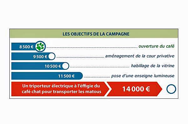 Nous avons dû tout financer par nous-mêmes, grâce à un héritage, car les banques que nous avons consultées ont toutes fini par refuser nos demandes de prêt. Le projet leur semblait trop atypique. C’est la raison pour laquelle nous avons lancé une campagne participative sur Kiss Kiss Bank Bank, car il nous manquait les derniers fonds nécessaires pour aménager la cuisine pro, la cour et les installations pour les chats. Cela nous permet aussi de nous faire connaitre, car nous avons décidé de communiquer sur notre projet peu de temps avant l’ouverture, afin que les futurs visiteurs soient sûrs de la concrétisation du projet, et ne pas créer une attente sans que rien n’arrive en fin de compte. Nous avons réussi à atteindre le 1er objectif de la campagne, mais nous avons besoin d’un peu plus pour pouvoir effectuer tous les aménagements pour que notre projet soit abouti. La campagne de crowdfunding se termine dans un peu moins d’une semaine, avec des contreparties valables dès l’ouverture du café !