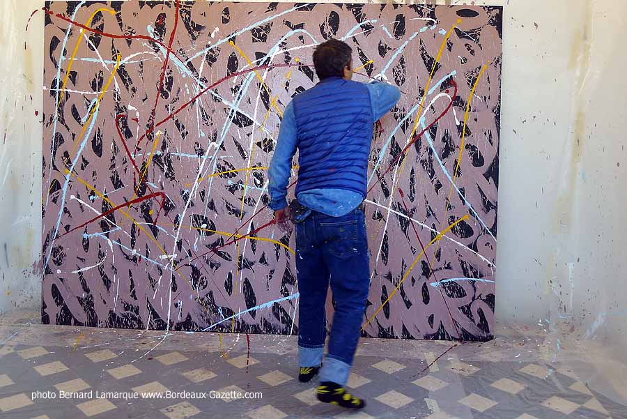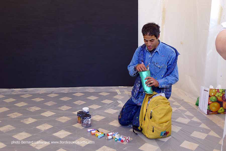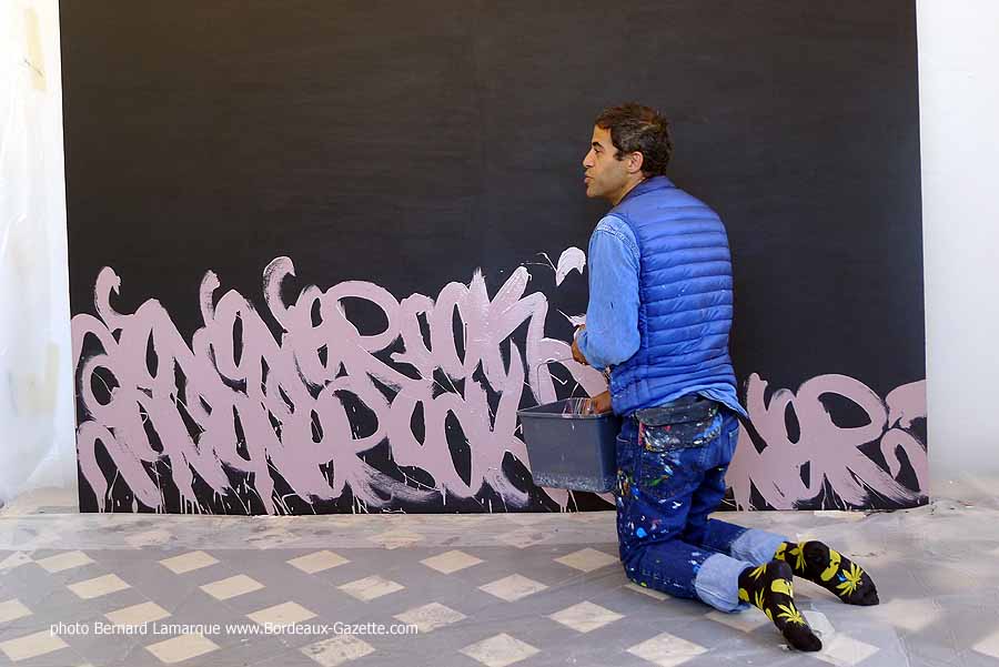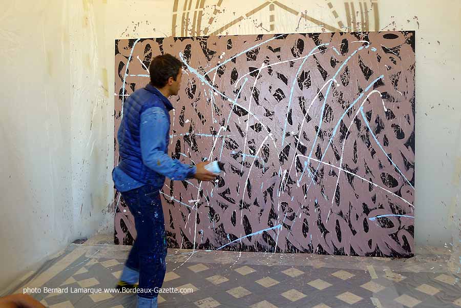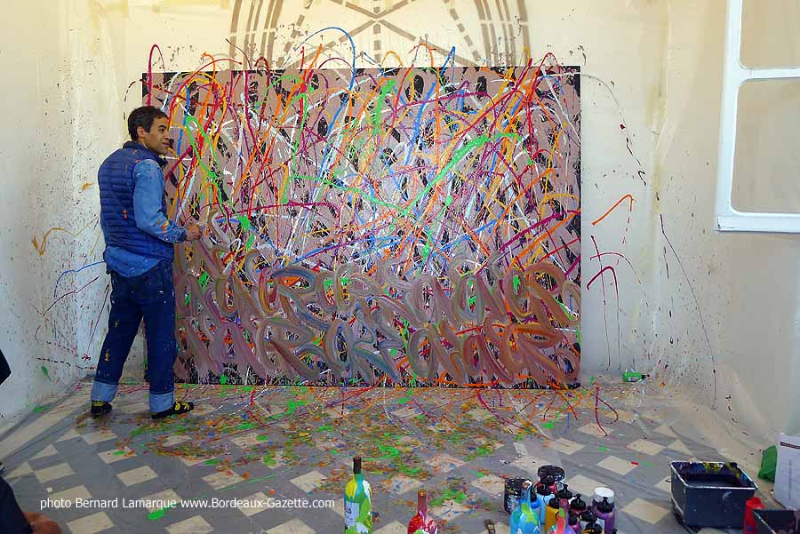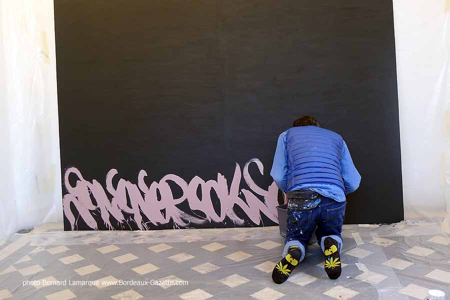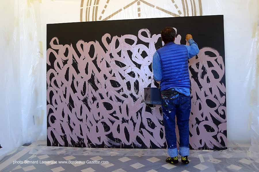 C’est dans le petit pavillon situé à l’entrée du château Labottière que JonOne a réalisé sa performance devant de très nombreux curieux dont certains venaient de loin. Durant son travail il a refait son historique avec beaucoup d’humour comme à l’habitude et on a tout appris sur lui à ses débuts où il n’hésitait pas à chaparder de la peinture.