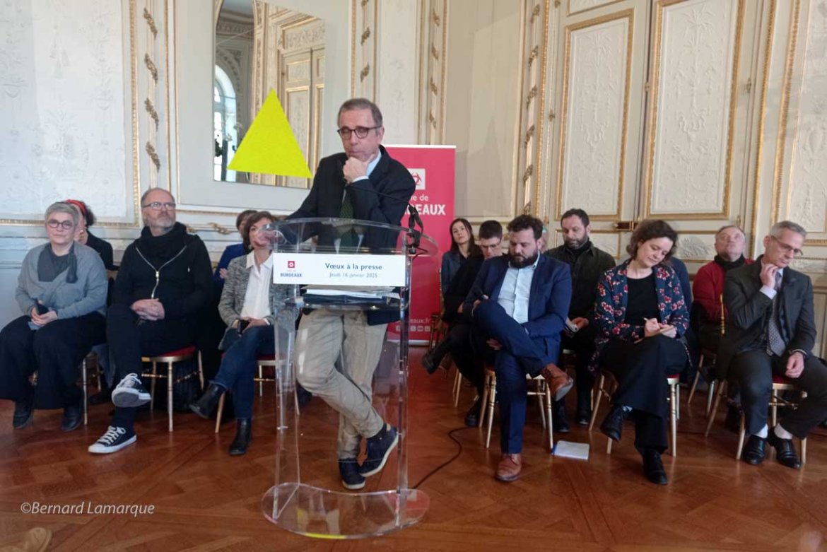 Il a fait état d’une profonde misère qui s’aggrave dans la ville ce qui l’a amené à parler de la Nuit de la Solidarité qui débutera le jeudi 23 janvier à 20 heures. A 18 heures lors d’un point presse à l’hôtel de ville, Pierre Hurmic maire de Bordeaux présentera le déroulé et les enjeux de la Nuit de la solidarité 2025 avant qu'elle ne débute. Le maire a aussi précisé que Bordeaux est une ville engagée avec 548 associations et que la ville lutte pour le droit des femmes et pour l'amélioration des quartiers comme celui de Marne Capucins qui regroupe 23 300 bordelais et la mairie s’attache à la prévention et l’étude en profondeur des différents quartiers. Il a aussi mentionné les travaux de Lescure avec les aménagements futurs des ombrières en panneaux photovoltaïques, ainsi que l’installation de 22.000 m² sur la Base Sous-Marine faisant de Bordeaux une ville solaire. Elle deviendra d’ici la fin de l’année, la plus grande centrale solaire urbaine de la ville. Il a avançait l’idée d’ombrières photovoltaïques sur le pont Simone Veil pour permettre de réduire la chaleur sur le pont en été tout en générant de l’énergie renouvelable. Il a aussi cité les travaux du Musée d’Aquitaine qui devraient se terminer en Mai. Il a fait état des temps forts qui vont se dérouler dans l’année. Il a envisagé la sécurité en indiquant le renforcement de la police municipale. On a eu droit à une forme de catalogue à la Prévert ouvrant de multiples pistes ne serait-ce que sur le sport bordelais qui a brillé en 2024 avec les Boxers vice-champion de France de Hockey comme l’UBB en rugby ainsi que les Lionnes qui elles ont renouvelé leur bail de championnes de France de Rugby Féminin. Il a eu aussi une intervention en faveur des journalistes dont il considère que le travail est essentiel avec la possibilité de rapporter des faits exacts et il a même fait allusion à la devise du Canard Enchaîné qui se formule comme suit : La liberté de la presse ne s’use que si ’on ne s’en sert pas. Une manière détournée de s’en prendre aux réseaux sociaux. Il a aussi précisé que 2025 serait une année clé pour le climat. Après l’élection de Trump , on peut se demander dans quel sens. Dans la rubrique des questions qui fâchent, il n’a pas abandonné le combat contre le GPSO en faisant allusion au projet de Notre Dame des Landes qui avait été abandonné après force contestations.