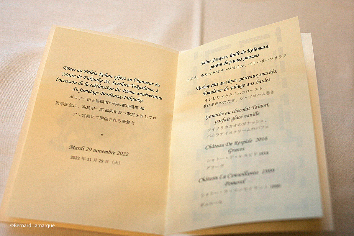 Et c’est ainsi que Bordeaux propose un partenariat d’échanges de savoir-faire et de réalisations, permettant à la fois de sensibiliser les citoyens aux enjeux sociaux, environnementaux et économiques, et d’assurer leur qualité de vie en limitant les impacts sur l’environnement. Pour sceller toutes ces bonnes intentions rien de mieux qu’un bon repas pour rapprocher les liens et c’est ainsi que les convives ont reçus un sympathique menu rédigé en français et en japonais pour suivre le développement des agapes.
