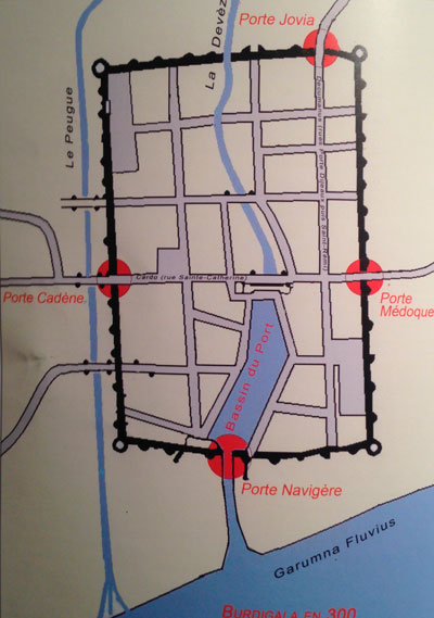 Un port est creusé à l’intérieur de la ville, alimenté par la rivière Devèze et la source-fontaine Divona, et c’est la porte « Navigère » (cf plan, emplacement actuel : rue de la Devise, rue du Cancera, place du Parlement) qui protège l’entrée du port des envahisseurs.