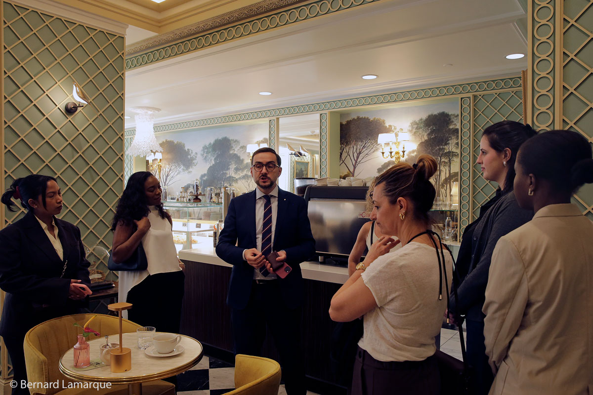 Ces quatre jeunes filles font parties d’une Ecole de Management de Luxe qui les conduira à œuvrer embrasser une carrière dans le milieu du luxe. Tout au long de leurs études, les étudiants visitent régulièrement et elles sont amenées régulièrement à être confrontés avec des établissements de luxe pour leur permettre d’intégrer les codes et les clés du management de ce secteur si particulier. En comprendre les clés dans leur description et leur fonctionnement. Que ce soit à Bordeaux, à Biarritz , à Reims, à Nice et Monaco, ou encore à Lyon - partout les établissements de luxe leurs ouvrent leurs portes pour leur faire découvrir l’envers du décor. A Bordeaux où elles viennent de séjourner quelques jours pour visiter quelques établissements de renoms, elles ont ainsi pu découvrir le célèbre Intercontinental qui fait face aux Grand Théâtre, lieu symbolique s’il en est, et fréquenté par une nombreuse clientèle d’habitués et de moins habitués venus du monde entier dont le séjour moyen est de trois jours comme l’a confirmé Anthony Souchard. Ce dernier, grand amoureux de son établissement, en parle avec passion tout en présentant les restaurants de l’hôtel : la brasserie « le Bordeaux » et le restaurant gastronomique étoilé le « Pressoir d’Argent ». Il explique avec gourmandise le choix des cartes et les influences culinaires, le parti-pris des couleurs et des tons qui président à la décoration s’approchant de ceux de l’intérieur du Grand Théâtre.