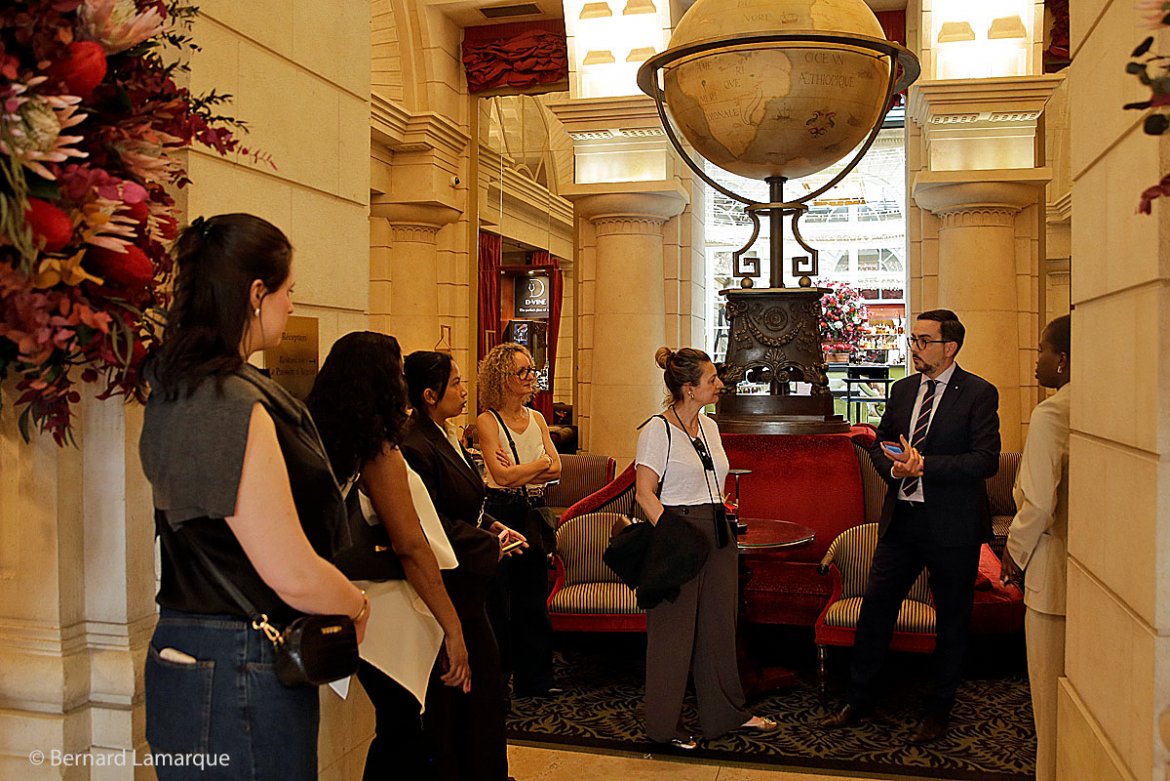 On est réchauffé par les tons de rouge, de pourpre, d’orange les tons cuivrés qui donnent une grande chaleur et nos étudiantes suivent avec attention les propos de l’hôte qui fait visiter son lieu de travail avec beaucoup de précisions. Tout au long des plus deux heures trente de la visite découverte, Anthony Souchard a abordé les multiples aspects professionnels du management de cet établissement proposant a consacré à ces étudiantes pour leur faire découvrir le site avec ses 130 chambres toutes décorées de ces tons sépia et or avec des aménagements particuliers ultra-luxe comme elles ont pu le découvrir dans la suite Royale avec ses 180 m² et son escalier qui donne accès direct à un rooftop privé, avec certains détails sur les aménagements intérieurs de cette Suite Royale. Nos quatre jeunes filles - en tant que futures managers - ont pu poser toutes leurs questions sur la gestion d’un tel établissement : les qualités et compétences recherchées, la politique environnementale, le taux d’occupation, la saisonnalité, etc. Elles n’ont perdu aucun détail fourni par leur guide qui à chaque instant a su leur faire découvrir les caractéristiques singulières et atypiques de l’établissement de luxe. détail inédit lié à l’espace découvert sous la conduite bienveillante et éclairée d’Anthony. Sara Daoudi a particulièrement apprécié découvrir un cinq étoiles si singulier, symbole du patrimoine de Bordeaux. de l’histoire de la ville et si singulier en dehors de Paris et l’a trouvé différent des autres hôtels de Bordeaux car elles ont eu l’occasion d’en visiter d’autres durant leur séjour. De l’avis du maître de la visite, il n’y a pas d’hôtel capable de rivaliser avec l’Intercontinental sauf dans un style très différent les Caudalies qui n’est pas à Bordeaux centre.
