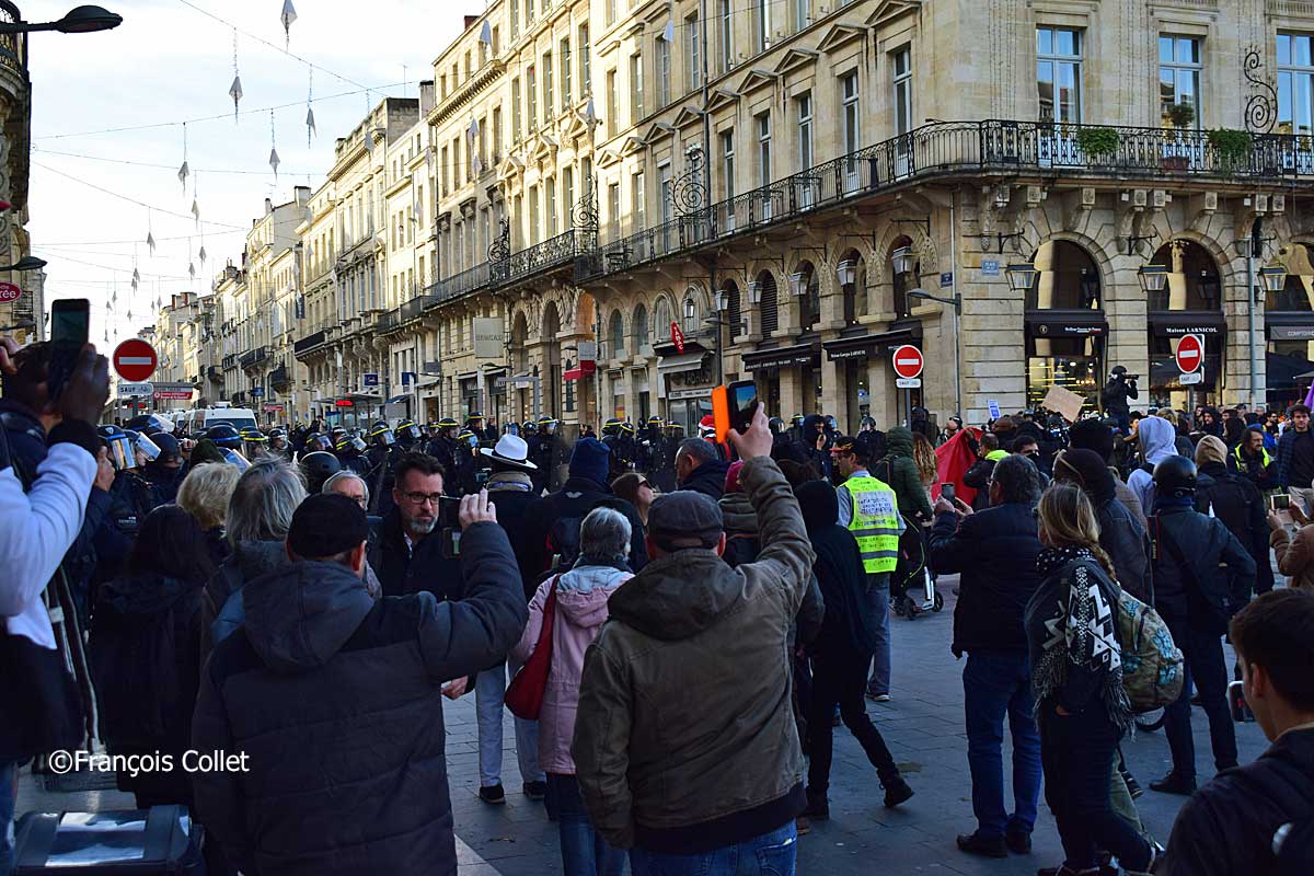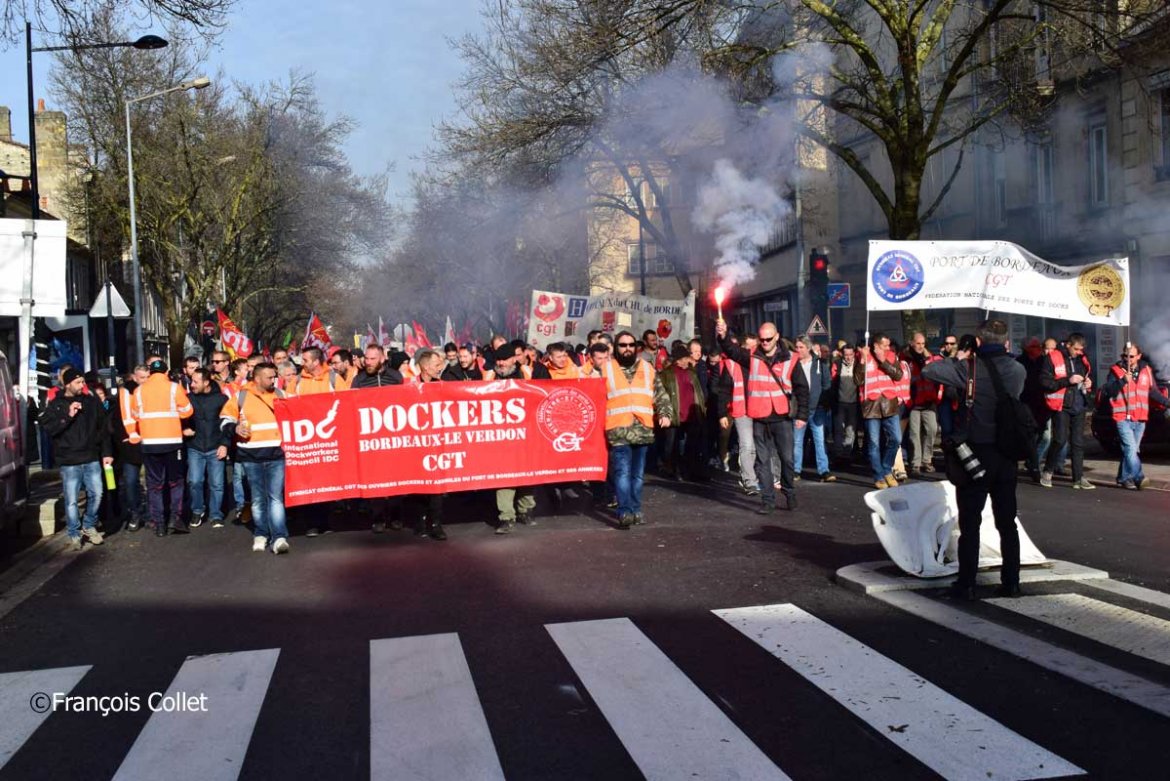 « Macron t’es foutu, le peuple est dans la rue », ou encore « on ne lâche rien ». C’est ce que l’on a souvent pu entendre au cours du défilé. Moins nombreux que la semaine dernière, les manifestants apparaissent pourtant toujours aussi déterminés si ce n’est plus. Tous réunis suite à un appel intersyndical, où seul la CFDT demeure absente, et à qui se sont de nouveau greffés en nombre étudiants, gilets jaunes, retraités et quelques écologistes. Etudiants en tête, le cortège a quitté la place de la République vers 12h pour commencer son cheminement à travers Bordeaux destination place de la Bourse où des activistes d’Extinction Rebellion ont remplacé une affiche publicitaire par une banderole avec le slogan « Dernière sommation avant extinction ». Le soleil était de nouveau présent et l’ensemble de la manifestation s’est plutôt bien déroulé jusqu’aux Quinconces. Mais le cortège a décidé de prolonger sa route jusqu’à la place de la Comédie où un important dispositif policier les attendait. L’ambiance était bon enfant et la tête du cortège a fait face aux forces de l’ordre quelques instants avant que ces derniers ne décident, sans sommation, de disperser tout le monde à coups de grenades lacrymogènes. C’est donc à nouveau dans un suffoquant nuage que s’est soldée cette journée de mobilisation. Pourtant comme souvent, la plupart des manifestants sont pacifiques. A l’image des dockers, certes bruyants mais « pas là pour foutre sur la gueule des camarades » selon l’un d’eux en désignant les CRS. Seuls quelques radicaux ont joué la provocation avec les forces de l’ordre sur les quais avant que tout le monde ne finisse par se disperser en fin de journée.
