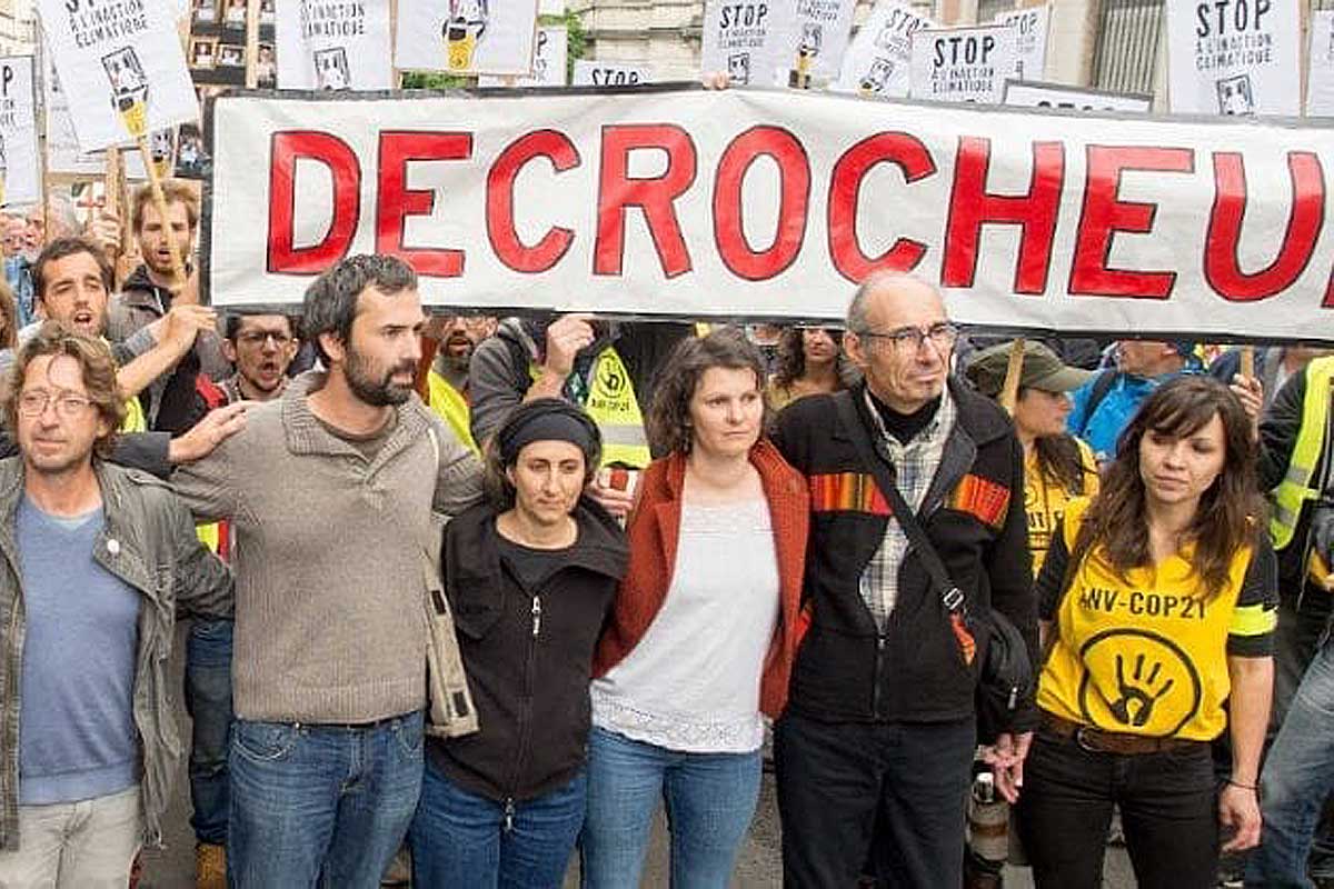 Au cours de l’audience, les Décrocheuses ont expliqué que face à des gouvernements successifs qui ne prennent pas de mesures fortes malgré les cris d’alarme des scientifiques, l’effondrement du vivant et de la biodiversité, c’est l’urgence qui a motivé leur action de désobéissance civile. La défense a fait citer Juliette Mignot, climatologue-océanographe, pour témoigner de l’urgence climatique. Elle a insisté sur la nécessité d’agir rapidement et radicalement pour faire baisser nos émissions de gaz à effet de serre : « chaque dixième de degré compte, chaque année compte ». Après une réquisition modérée du procureur (amendes de 100 euros avec sursis), la juge a donc prononcé la relaxe. Léa Chancelier, activiste relaxée, s’en félicite : « Cette relaxe résonne comme une confirmation du message que nous portons : oui, l’urgence climatique impose des mesures radicales et courageuses ; non, le gouvernement d’Emmanuel Macron ne prend pas ces mesures nécessaires, malgré ses discours ! Et puisqu’il n’assume pas ses responsabilités, c’est notre devoir de citoyennes et de citoyens de lui rappeler ses engagements. » Les prévenues ont pu célébrer cette victoire judiciaire avec leurs soutiens, dont une centaine étaient venus les accompagner ce matin, parmi lesquels des représentants de collectifs locaux ainsi que l’eurodéputée Michèle Rivasi.