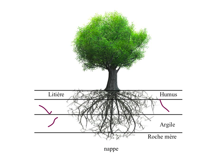- Au plus profond (3° niveau) git la roche mère, sous la forme de calcaire, de schiste ou de granit, composée de silice, de fer et d’aluminium. Ces trois derniers composants piégés dans les roches ne sont pas atteignables. Ce sont les microbes et aussi les racines des plantes qui vont attaquer la roche mère et « libérer » les éléments minéraux qui se mélangent avec l’eau pour créer des argiles, éléments minéraux de la terre.
