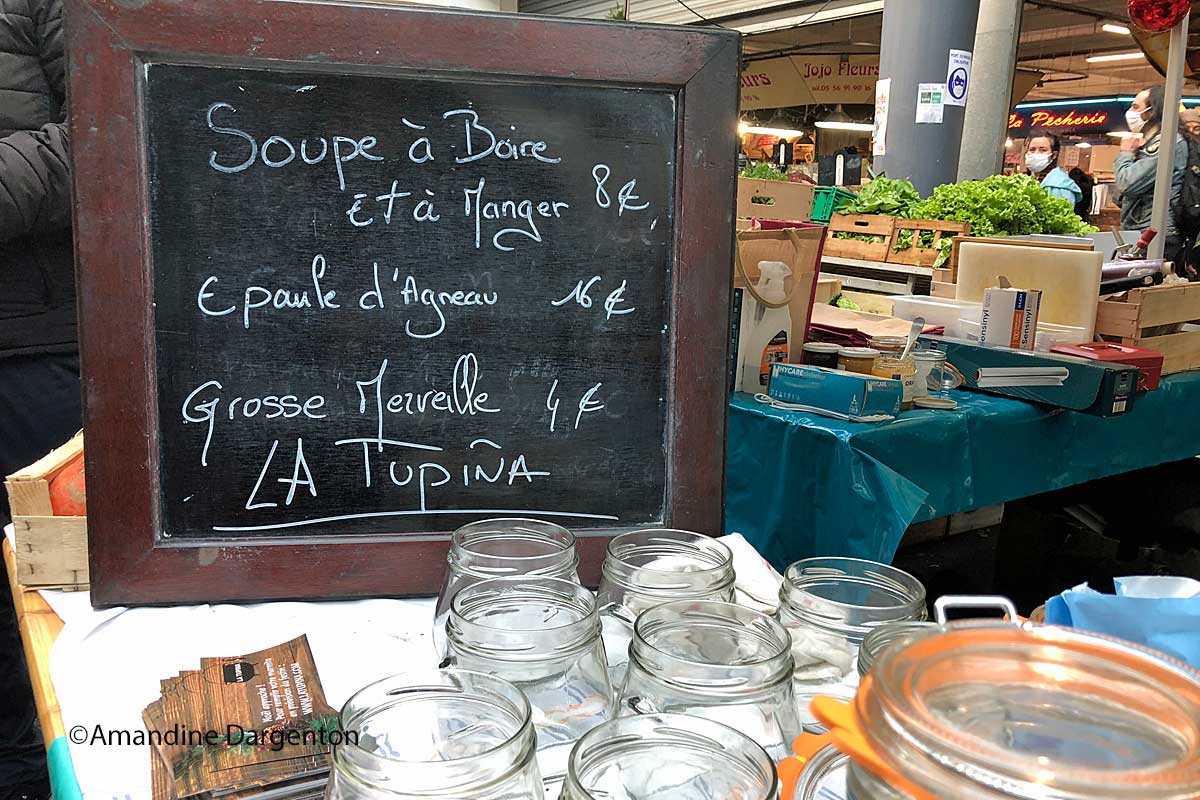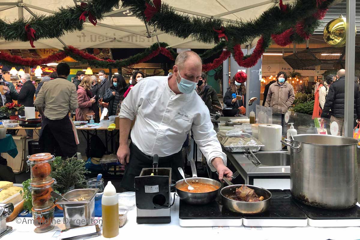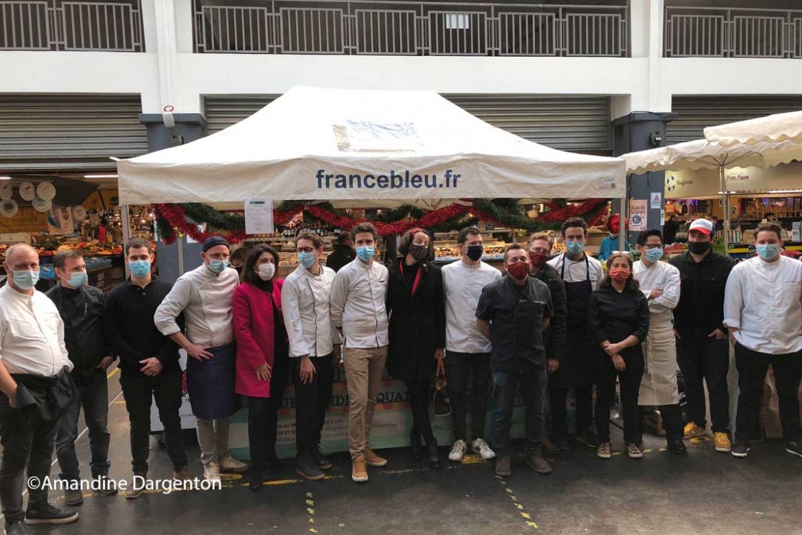 Ce vendredi matin, les habitués du marché des Capucins regardent avec curiosité ce nouveau stand, dans l’allée centrale. Les chefs, vêtus de cols blancs ou noirs, s’agitent derrière sauteuses et rondeaux (marmites). Ils discutent, plaisantent, profitent de leurs retrouvailles. Pour Franck Audu, propriétaire et chef de la Tupina, la joie est grande. « Pouvoir enfin retrouver ce contact humain avec le client, cette dynamique, c’est un immense plaisir pour nous. » s’émeut-il. Un sentiment partagé par ces paires. Juliette Nouchy, chef au restaurant Chemins de Tables, opine, « c’est une excellente idée. De plus, cela peut nous apporter de bonnes répercussions, nous ajouter un peu de visibilité ». Ils offrent leur carte de visite aux clients, leur rappelant qu’ils peuvent venir manger dans leur restaurant grâce aux ventes à emporter. Tous assureront à tour de rôle la tenue du stand le carré des Chefs jusqu’au dernier jour de l’opération, samedi 2 janvier. Vous aurez ainsi l’occasion de les voir défiler tout au long de cette période et ils vous attendent nombreux afin de vous rencontrer pour pouvoir vous présenter leurs créations.
