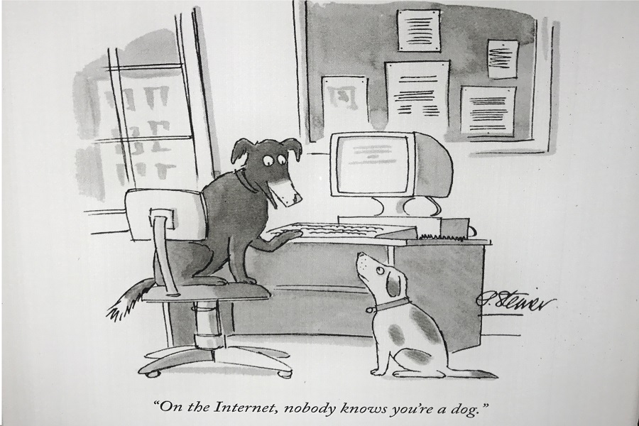 Romain Tardy, né à Paris il y a 32 ans est un artiste visuel qui développe son travail en mêlant image, lumière, son et mouvement pour questionner le monde numérique. Ses installations font souvent appel à la technique du mapping vidéo qui entraîne un questionnement permanent sur le rapport qu’entretient la réalité face à l’imagerie informatique et les changements sociétaux qu’elle induit. Elles utilisent la lumière comme moyen pour augmenter des architectures existantes ou des structures imaginées par l’artiste. Comme ici lors de l’exposition Nobody knew you’re a dog. Un titre qui d’ailleurs n’est autre que le détournement de la légende d’un dessin de Peter Steiner paru en 1993 dans The new Yorker. On y voit deux chien qui discutent et l’un dit a l’autre : « Sur internet personne ne sait que tu es un chien ». Une dessin qui pointait déjà à l’époque le développement massif d’internet ainsi que la dématérialisation du monde et des personnes.