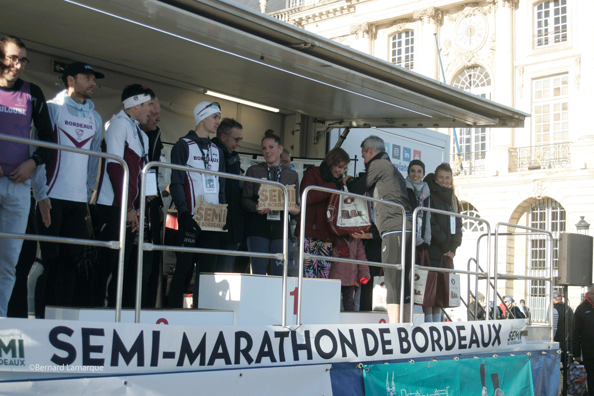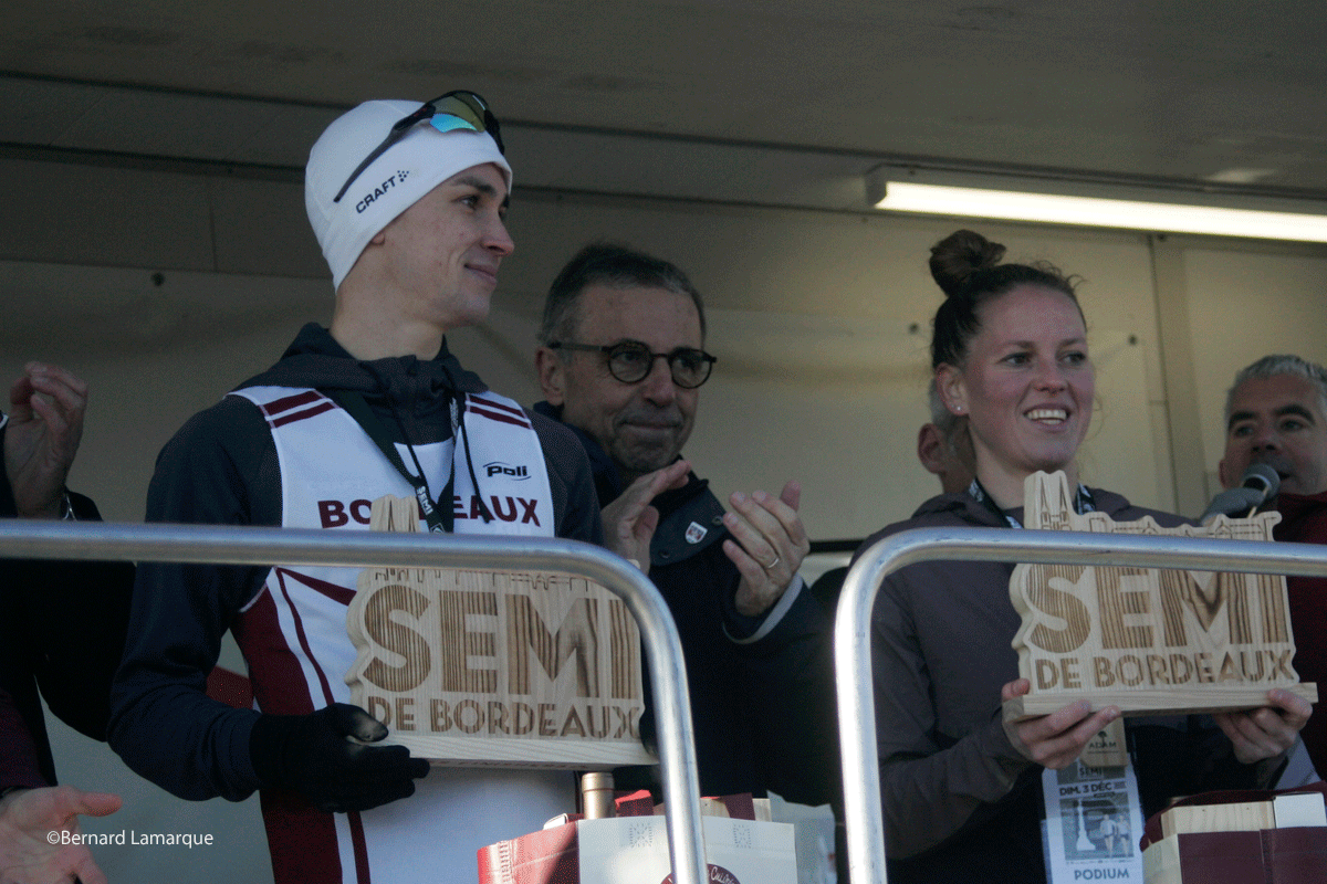 - Les vainqueurs masculin (Clément Deflandre) et féminin (Marylin Allain) du Semi Marathon de Bordeux avec le maire : Pierre Hurmic