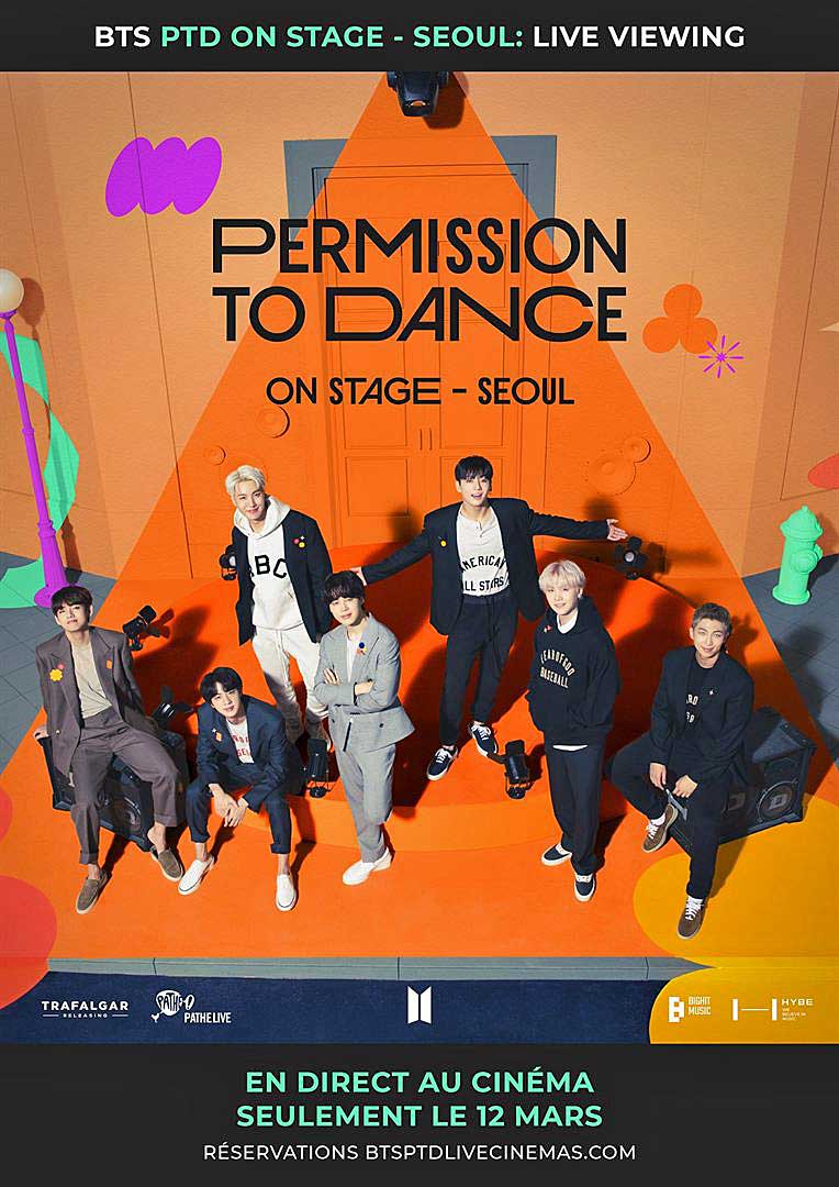 « BTS PERMISSION TO DANCE ON STAGE » est la dernière série d’une tournée mondiale de BTS, les icônes de la pop du 21e siècle, avec des performances impressionnantes et les plus grands succès de leur incroyable carrière. Les premiers spectacles de Los Angeles ont été vus par environ 813 000 personnes sur quatre spectacles joués à guichets fermés, ce qui en fait l’un des shows les plus réussis de 2021. Ne manquez pas "BTS PERMISSION TO DANCE ON STAGE – SEOUL : EN DIRECT" pour voir RM, Jin, SUGA, j-hope, Jimin, V et Jung Kook sur grand écran dans votre cinéma le samedi 12 mars uniquement.