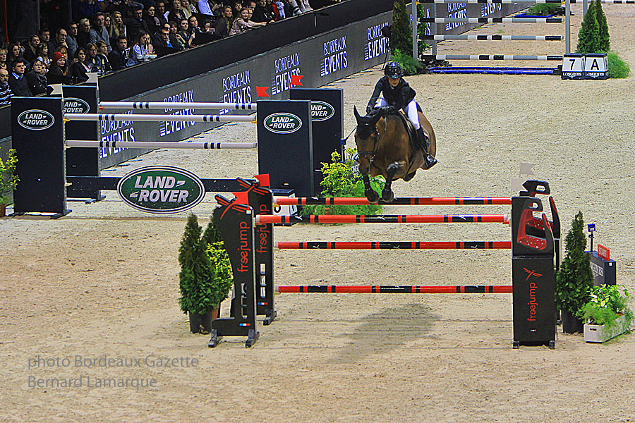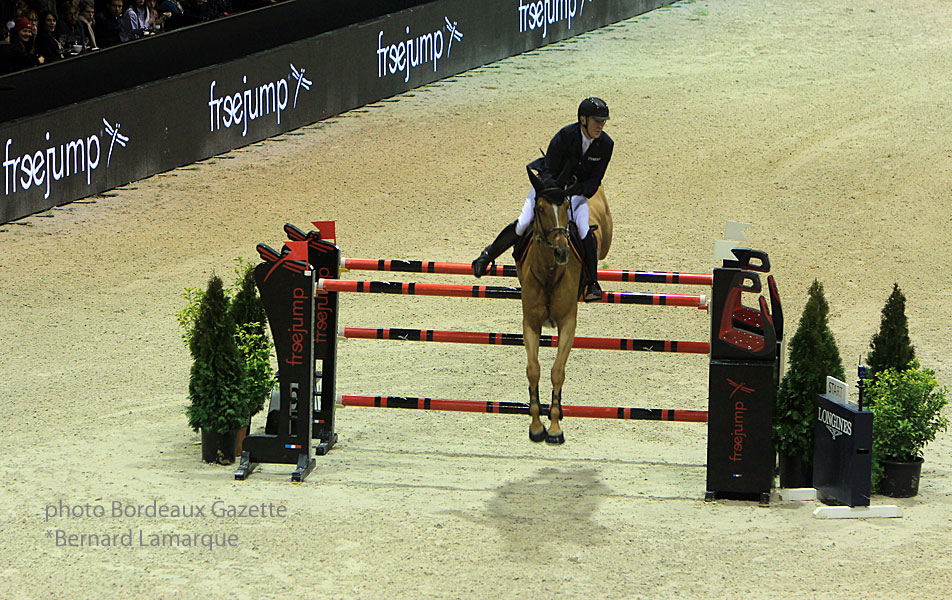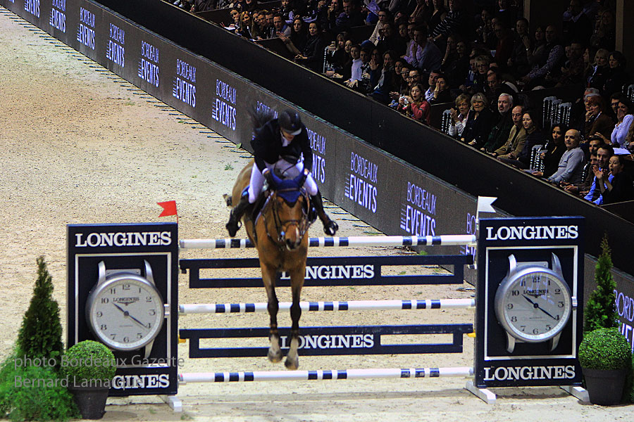 Le parcours sélectif qui se disputait sur 13 obstacles, permis à seulement 10 cavaliers de prétendre au barrage. Les locaux Olivier Robert et Aldrich Cheronnet n’en firent hélas pas parti,au grand dépit du public Bordelais ! Pour très peu, pour le second qui fit une toute petite faute sur l’avant dernier obstacle ! Le barrage, épreuve de vitesse ou les cavaliers concourent sur seulement 9 obstacles fit monter la pression tant du public que des cavaliers eux meme. A noter la très belle prestation de la toute jeune cavalière suédoise Irma Karisson, 20 ans à peine et son exceptionnel cheval Chaconnu ! mais cela était sans compter avec la présence et l’expérience de Pieter Devos qui remporta ce Grand Prix sans conteste. Tour rapide, fluide et maîtrisé absolue pour ce cavalier Belge qui signa son parcours en 36 s 53 loin devant les autres concurrents.