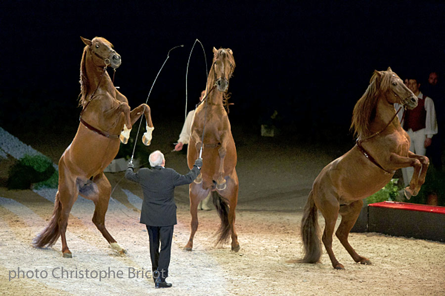 Jeudi soir, Alexis Gruss, Maitre écuyer de renommée internationale et sa famille nous ont montré toute l’étendue de leur talent avec une création exclusive pour le Jumping. « l’art de la piste ». C’est Autour de cette piste de 13m, de la longueur d’une chambrière, qu’est le jeu des prouesses équestres de la famille Gruss depuis 6 générations. Pour ce spectacle, 40 étalons et 12 cavaliers étaient présent. Portée, voltige, jonglage et acrobaties se sont succédés dans la plus grande liberté et pour le plaisir des spectateurs Bordelais. Pour Alexis Gruss, ce cirque à « l’ancienne » est encore une façon de perpétuer les traditions équestre. Pour lui cirque et chevaux sont indissociable, Il se défini lui même être un « homme de spectacle passionné par les chevaux » comme son aïeul, créateur de leur compagnie en 1854 ! une belle histoire de famille et de passion a découvrir sans modération.