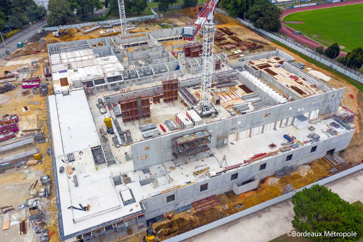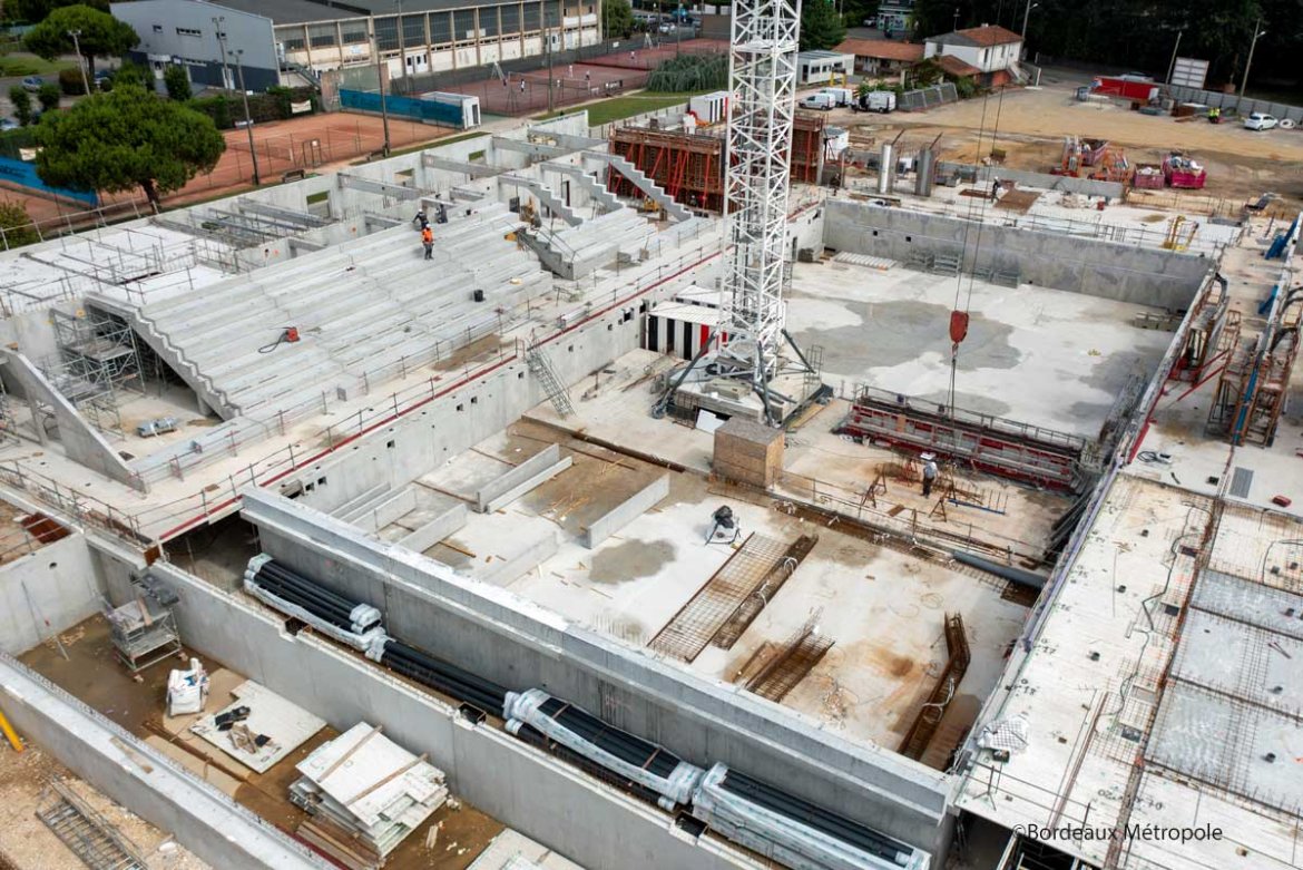 Alain Anziani, Maire de Mérignac, Président de Bordeaux Métropole et Brigitte Bloch, Vice-présidente de Bordeaux Métropole Tourisme, événements et équipements métropolitains ont fait ce jour un point d’étape du stade nautique métropolitain à Mérignac lors d’une visite de chantier.