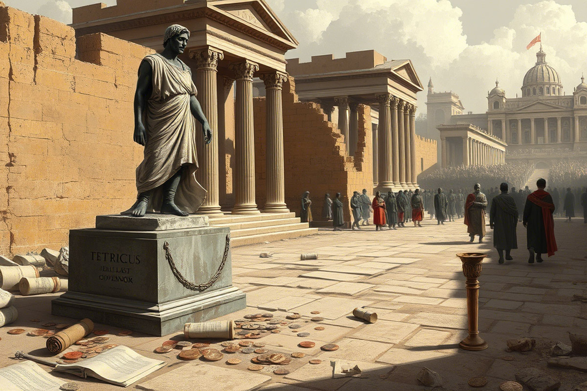 En 274, la situation devient intenable. L’empereur Aurélien, déterminé à restaurer l’unité de l’Empire, mène une campagne décisive contre l’Empire des Gaules. À la bataille de Châlons, Tetricus, affaibli par les révoltes et les désertions, est vaincu. Une légende raconte qu’il aurait secrètement négocié sa reddition avec Aurélien pour éviter un massacre inutile.