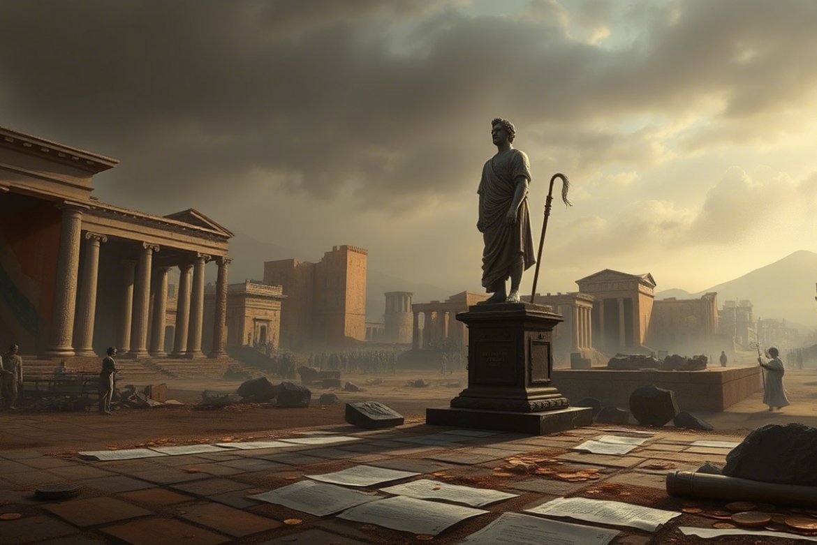 - Illustration d’une ville antique en déclin, avec des bâtiments romains partiellement en ruines, des colonnes brisées et des rues désertes. Le ciel est sombre, avec des nuages gris évoquant une atmosphère de fin d’ère.