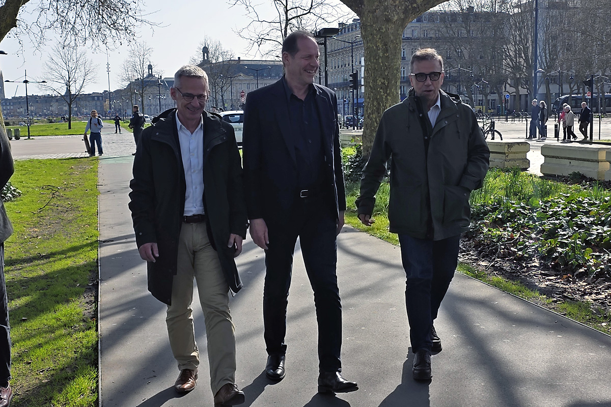 - De gauche à droite : Mathieu Hazouard (Adjoint au maire chargé des sports), Christian Prudhomme (directeur du Tour de France) et Pierre Hurmic (Maire de Bordeaux)